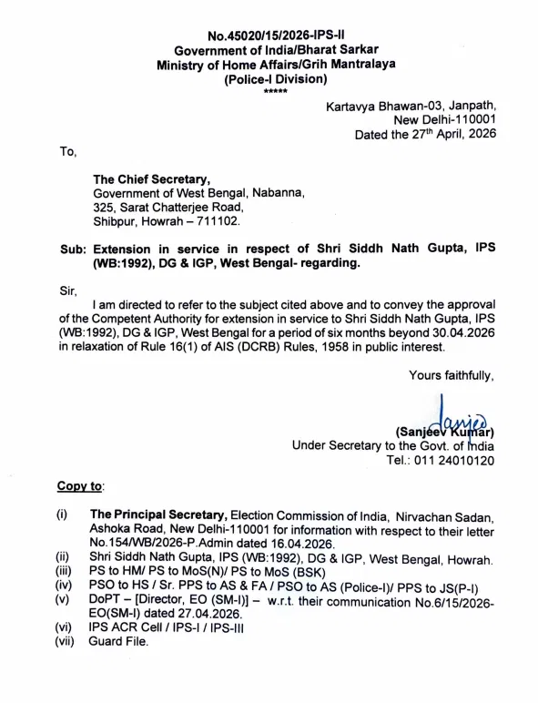 ਨਵੀ ਦਿੱਲੀ, 27 ਅਪ੍ਰੈਲ (ਵਿਸ਼ਵ ਵਾਰਤਾ): ਕੇਂਦਰ ਸਰਕਾਰ ਨੇ ਪੱਛਮੀ ਬੰਗਾਲ ਦੇ ਪੁਲਿਸ ਡਾਇਰੈਕਟਰ ਜਨਰਲ ਅਤੇ ਇੰਸਪੈਕਟਰ ਜਨਰਲ (IGP) ਸਿੱਧ ਨਾਥ ਗੁਪਤਾ ਦੀ ਸੇਵਾ ਨੂੰ ਉਨ੍ਹਾਂ ਦੀ ਤੈਅ ਸੇਵਾ ਮੁਕਤੀ ਦੀ ਤਰੀਕ ਤੋਂ ਬਾਅਦ ਛੇ ਮਹੀਨਿਆਂ ਲਈ ਵਧਾ ਦਿੱਤਾ ਹੈ। ਸੋਮਵਾਰ ਨੂੰ ਜਾਰੀ ਇੱਕ ਹੁਕਮ ਵਿੱਚ ਇਹ ਜਾਣਕਾਰੀ ਦਿੱਤੀ ਗਈ। ਉਹ ਇਸੇ ਮਹੀਨੇ ਦੀ 30 ਤਰੀਕ ਨੂੰ ਰਿਟਾਇਰ ਹੋਣ ਵਾਲੇ ਸਨ। ਇਸ ਸੇਵਾ ਵਾਧੇ ਨਾਲ ਉਨ੍ਹਾਂ ਦਾ ਕਾਰਜਕਾਲ ਛੇ ਮਹੀਨੇ ਹੋਰ ਵਧਾ ਦਿੱਤਾ ਗਿਆ ਹੈ।