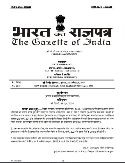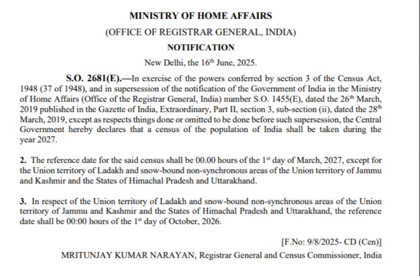 ਨਵੀ ਦਿੱਲੀ, 16 ਜੂਨ (ਵਿਸ਼ਵ ਵਾਰਤਾ): ਜਨਗਣਨਾ ਨੂੰ ਲੈ ਕੇ ਵੱਡੀ ਖ਼ਬਰ ਸਾਹਮਣੇ ਆਈ ਹੈ। ਦਰਅਸਲ, ਕੇਂਦਰੀ ਗ੍ਰਹਿ ਮੰਤਰਾਲੇ ਨੇ ਜਨਗਣਨਾ ਨੂੰ ਲੈ ਕੇ ਗਜ਼ਟ ਨੋਟੀਫਿਕੇਸ਼ਨ ਜਾਰੀ ਕਰ ਦਿੱਤਾ ਹੈ। ਜਿਸਦੀ ਲੰਬੇ ਸਮੇਂ ਤੋਂ ਉਡੀਕ ਕੀਤੀ ਜਾ ਰਹੀ ਸੀ, ਉਹ ਆਖਰਕਾਰ ਖਤਮ ਹੋ ਗਈ ਹੈ। ਇਸ ਤੋਂ ਪਹਿਲਾਂ ਐਤਵਾਰ ਨੂੰ ਕੇਂਦਰੀ ਗ੍ਰਹਿ ਮੰਤਰੀ ਅਮਿਤ ਸ਼ਾਹ ਨੇ ਜਨਗਣਨਾ ਕਰਵਾਉਣ ਦੀਆਂ ਤਿਆਰੀਆਂ ਦਾ ਜਾਇਜ਼ਾ ਲਿਆ।