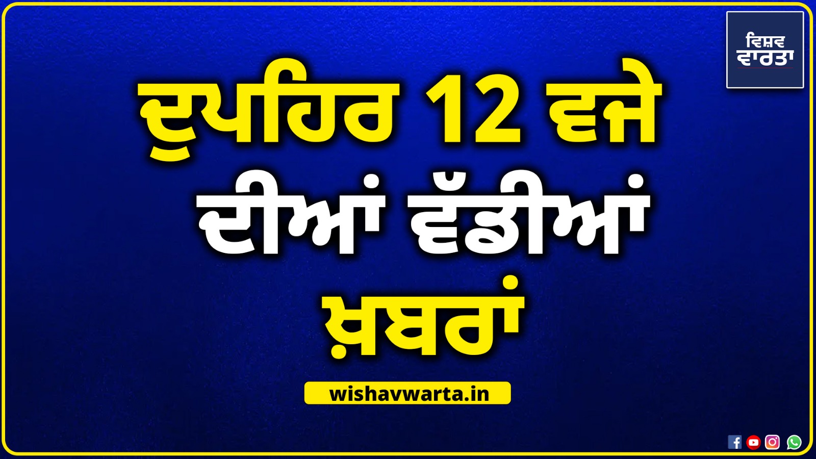 ਚੰਡੀਗੜ੍ਹ, 21 ਮਾਰਚ 2026 (ਵਿਸ਼ਵ ਵਾਰਤਾ) – ਦੁਪਹਿਰ 12 ਵਜੇ ਦੀਆਂ ਵੱਡੀਆਂ ਪ੍ਰਮੁੱਖ ਖਬਰਾਂ (BIG BREAKING) ਹੇਠ ਦਿੱਤੇ ਅਨੁਸਾਰ ਹਨ। ਪੂਰੀਆਂ ਖਬਰਾਂ ਪੜ੍ਹਨ ਲਈ ਹੇਠਾਂ ਦਿੱਤੇ ਲਿੰਕਾਂ ‘ਤੇ ਕਲਿੱਕ ਕਰੋ……..
