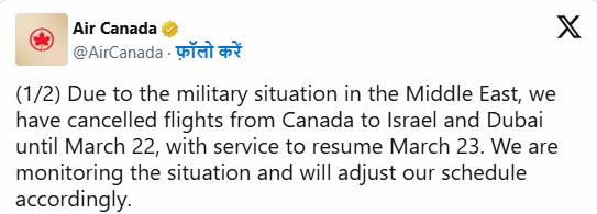 ਏਅਰ ਕੈਨੇਡਾ ਨੇ ਸੋਸ਼ਲ ਮੀਡੀਆ ਪਲੇਟਫਾਰਮ X (ਪਹਿਲਾਂ ਟਵਿੱਟਰ) ‘ਤੇ ਲਿਖਿਆ, ‘ਮਿਡਲ-ਈਸਟ ਵਿੱਚ ਫੌਜੀ ਸਥਿਤੀ ਦੇ ਕਾਰਨ ਅਸੀਂ ਕੈਨੇਡਾ ਤੋਂ ਇਜ਼ਰਾਈਲ ਅਤੇ ਦੁਬਈ ਜਾਣ ਵਾਲੀਆਂ ਉਡਾਣਾਂ 22 ਮਾਰਚ ਤੱਕ ਰੱਦ ਕਰ ਦਿੱਤੀਆਂ ਹਨ ਅਤੇ ਸੇਵਾ 23 ਮਾਰਚ ਤੋਂ ਮੁੜ ਸ਼ੁਰੂ ਹੋਵੇਗੀ। ਅਸੀਂ ਸਥਿਤੀ ‘ਤੇ ਨਜ਼ਰ ਰੱਖ ਰਹੇ ਹਾਂ ਅਤੇ ਉਸੇ ਅਨੁਸਾਰ ਆਪਣੇ ਪ੍ਰੋਗਰਾਮ ਵਿੱਚ ਬਦਲਾਅ ਕਰਾਂਗੇ।’