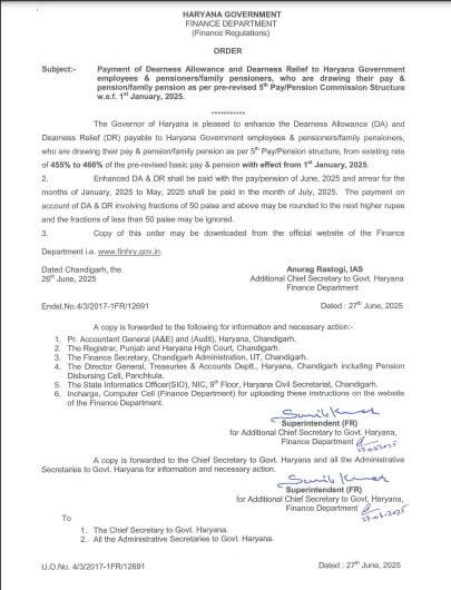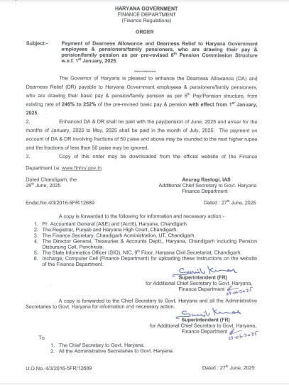 ਚੰਡੀਗੜ੍ਹ, 28 ਜੂਨ (ਵਿਸ਼ਵ ਵਾਰਤਾ): ਹਰਿਆਣਾ ਦੇ ਸਰਕਾਰੀ ਕਰਮਚਾਰੀਆਂ ਲਈ ਖੁਸ਼ਖਬਰੀ ਹੈ। ਹਰਿਆਣਾ ਵਿੱਚ ਪੰਜਵੇਂ ਅਤੇ ਛੇਵੇਂ ਤਨਖਾਹ ਕਮਿਸ਼ਨ ਅਨੁਸਾਰ ਤਨਖਾਹ-ਪੈਨਸ਼ਨ ਪ੍ਰਾਪਤ ਕਰਨ ਵਾਲੇ ਕਰਮਚਾਰੀਆਂ ਅਤੇ ਪੈਨਸ਼ਨਰਾਂ ਦੇ ਮਹਿੰਗਾਈ ਭੱਤੇ (DA) ਅਤੇ ਮਹਿੰਗਾਈ ਰਾਹਤ (DR) ਵਿੱਚ 6 ਤੋਂ 11 ਪ੍ਰਤੀਸ਼ਤ ਦਾ ਵਾਧਾ ਕੀਤਾ ਗਿਆ ਹੈ। DA-DR ਵਿੱਚ ਇਹ ਵਾਧਾ 1 ਜਨਵਰੀ, 2025 ਤੋਂ ਲਾਗੂ ਹੋਵੇਗਾ। ਵਿੱਤ ਵਿਭਾਗ ਦੇ ਵਧੀਕ ਮੁੱਖ ਸਕੱਤਰ ਅਨੁਰਾਗ ਰਸਤੋਗੀ ਨੇ ਇਸ ਸਬੰਧੀ ਹੁਕਮ ਜਾਰੀ ਕੀਤੇ ਹਨ।