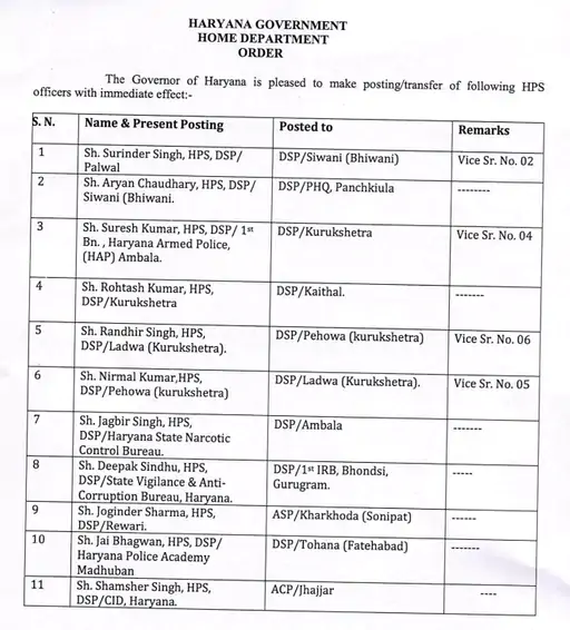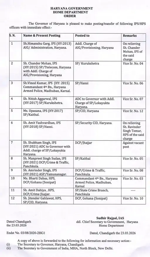 ਚੰਡੀਗੜ੍ਹ, 23 ਮਾਰਚ 2026 (ਵਿਸ਼ਵ ਵਾਰਤਾ): ਹਰਿਆਣਾ ਸਰਕਾਰ ਨੇ ਪੁਲਿਸ ਵਿਭਾਗ ਵਿੱਚ ਵੱਡਾ ਫੇਰਬਦਲ ਕੀਤਾ ਹੈ। ਸਰਕਾਰ ਵੱਲੋਂ ਜਾਰੀ ਅਧਿਕਾਰੀਆਂ ਦੀ ਤਬਾਦਲਾ ਸੂਚੀ ਵਿੱਚ 9 ਆਈ.ਪੀ.ਐੱਸ. (IPS) ਅਤੇ 14 ਐੱਚ.ਪੀ.ਐੱਸ. (HPS) ਅਧਿਕਾਰੀਆਂ ਦੇ ਤਬਾਦਲੇ ਕੀਤੇ ਗਏ ਹਨ । ਤਬਾਦਲਾ ਹੁਕਮਾਂ ਅਨੁਸਾਰ ਆਈ.ਪੀ.ਐੱਸ. ਵਿਨੋਦ ਕੁਮਾਰ ਨੂੰ ਐੱਸ.ਪੀ. (SP) ਹਾਂਸੀ ਲਗਾਇਆ ਗਿਆ ਹੈ। ਆਈਪੀਐਸ ਮਨਪ੍ਰੀਤ ਸੂਦਨ ਨੂੰ ਐਸਪੀ ਕੈਥਲ ਦੀ ਜ਼ਿੰਮੇਵਾਰੀ ਸੌਂਪੀ ਗਈ ਹੈ।