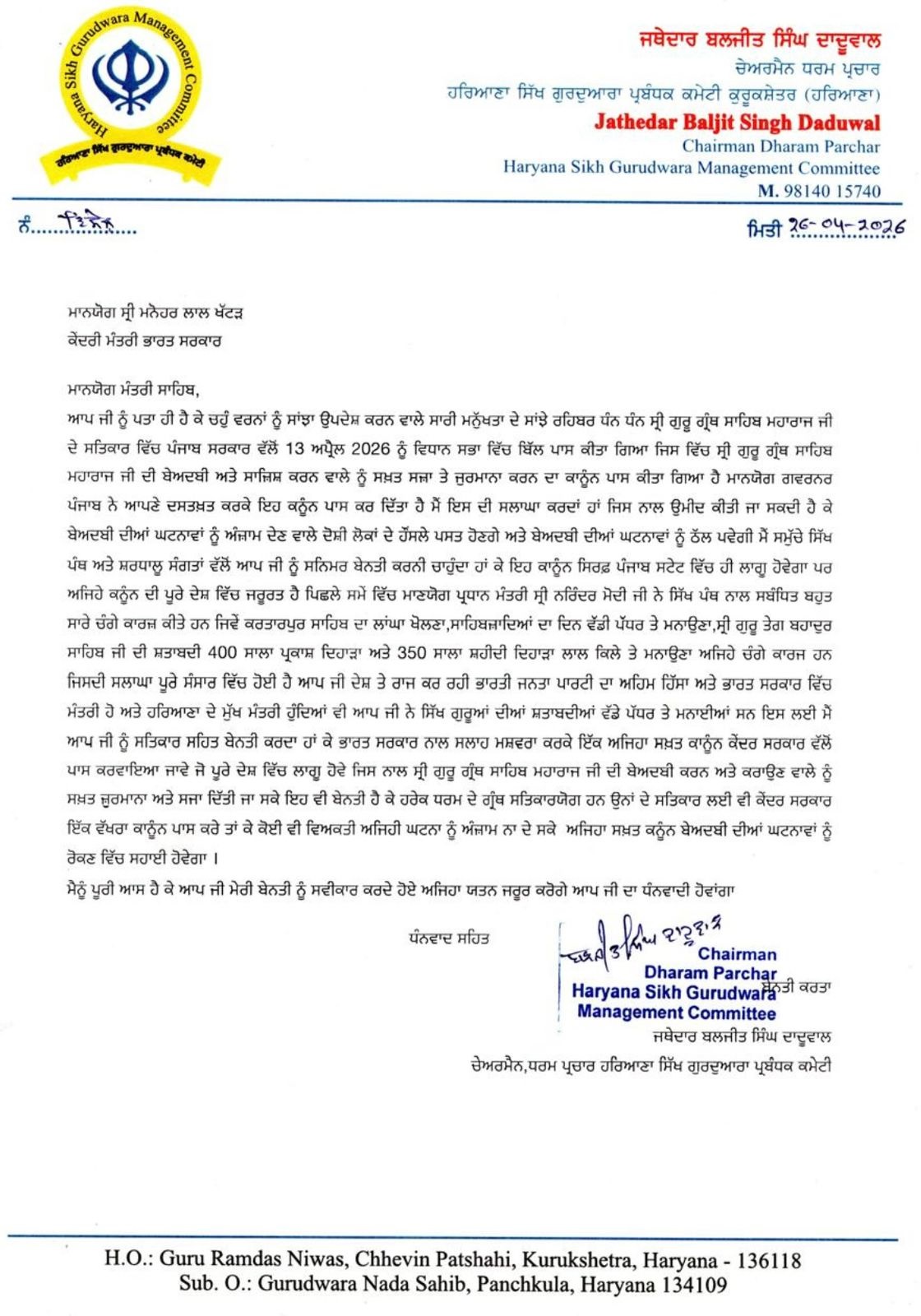 ਉਨ੍ਹਾਂ ਦੱਸਿਆ ਕਿ ਜਥੇਦਾਰ ਦਾਦੂਵਾਲ ਨੇ ਮੰਗ ਪੱਤਰ ਵਿੱਚ ਲਿਖਿਆ ਕਿ “ਮਾਣਯੋਗ ਮੰਤਰੀ ਸਾਹਿਬ ਆਪ ਜੀ ਨੂੰ ਪਤਾ ਹੀ ਹੈ ਕਿ ਚਹੁੰ ਵਰਨਾਂ ਨੂੰ ਸਾਂਝਾ ਉਪਦੇਸ਼ ਕਰਨ ਵਾਲੇ ਸਾਰੀ ਮਨੁੱਖਤਾ ਦੇ ਸਾਂਝੇ ਰਹਿਬਰ ਧੰਨ ਧੰਨ ਸ੍ਰੀ ਗੁਰੂ ਗ੍ਰੰਥ ਸਾਹਿਬ ਮਹਾਰਾਜ ਜੀ ਦੇ ਸਤਿਕਾਰ ਵਿੱਚ ਪੰਜਾਬ ਸਰਕਾਰ ਵੱਲੋਂ 13 ਅਪ੍ਰੈਲ 2026 ਨੂੰ ਵਿਧਾਨ ਸਭਾ ਵਿੱਚ ਬਿੱਲ ਪਾਸ ਕੀਤਾ ਗਿਆ, ਜਿਸ ਵਿੱਚ ਸ੍ਰੀ ਗੁਰੂ ਗ੍ਰੰਥ ਸਾਹਿਬ ਮਹਾਰਾਜ ਜੀ ਦੀ ਬੇਅਦਬੀ ਅਤੇ ਸਾਜ਼ਿਸ਼ ਕਰਨ ਵਾਲੇ ਨੂੰ ਸਖ਼ਤ ਸਜ਼ਾ ਤੇ ਜੁਰਮਾਨਾ ਕਰਨ ਦਾ ਕਾਨੂੰਨ ਪਾਸ ਕੀਤਾ ਗਿਆ ਹੈ ਗਵਰਨਰ ਪੰਜਾਬ ਨੇ ਆਪਣੇ ਦਸਤਖ਼ਤ ਕਰਕੇ ਇਹ ਕਨੂੰਨ ਪਾਸ ਕਰ ਦਿੱਤਾ ਹੈ ਅਤੇ ਮੈਂ ਇਸ ਦੀ ਸਲਾਘਾ ਕਰਦਾਂ ਹਾਂ ਜਿਸ ਨਾਲ ਉਮੀਦ ਕੀਤੀ ਜਾ ਸਕਦੀ ਹੈ ਕੇ ਬੇਅਦਬੀ ਦੀਆਂ ਘਟਨਾਵਾਂ ਨੂੰ ਅੰਜ਼ਾਮ ਦੇਣ ਵਾਲੇ ਦੋਸ਼ੀ ਲੋਕਾਂ ਦੇ ਹੌਂਸਲੇ ਪਸਤ ਹੋਣਗੇ ਅਤੇ ਬੇਅਦਬੀ ਦੀਆਂ ਘਟਨਾਵਾਂ ਨੂੰ ਠੱਲ ਪਵੇਗੀ ਮੈਂ ਸਮੁੱਚੇ ਸਿੱਖ ਪੰਥ ਅਤੇ ਸ਼ਰਧਾਲੂ ਸੰਗਤਾਂ ਵੱਲੋਂ ਆਪ ਜੀ ਨੂੰ ਬੇਨਤੀ ਕਰਨੀ ਚਾਹੁੰਦਾ ਹਾਂ ਕੇ ਇਹ ਕਾਨੂੰਨ ਸਿਰਫ਼ ਪੰਜਾਬ ਸਟੇਟ ਵਿੱਚ ਹੀ ਲਾਗੂ ਹੋਵੇਗਾ ਪਰ ਅਜਿਹੇ ਕਨੂੰਨ ਦੀ ਪੂਰੇ ਦੇਸ਼ ਵਿੱਚ ਜਰੂਰਤ ਹੈ