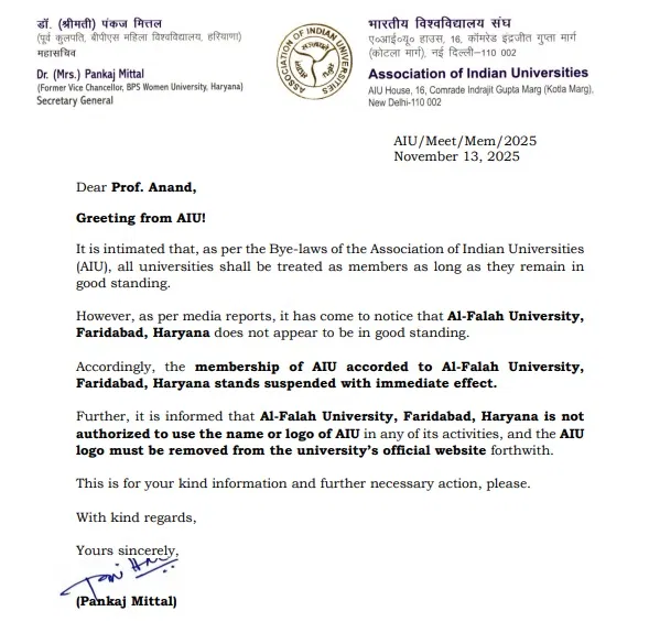 ਆਪਣੇ ਬਿਆਨ ਵਿੱਚ, ਏਆਈਯੂ ਨੇ ਕਿਹਾ ਕਿ ਐਸੋਸੀਏਸ਼ਨ ਆਫ ਇੰਡੀਅਨ ਯੂਨੀਵਰਸਿਟੀਜ਼ (ਏਆਈਯੂ) ਦੇ ਉਪ-ਨਿਯਮਾਂ ਦੇ ਅਨੁਸਾਰ, ਕਿਸੇ ਵੀ ਯੂਨੀਵਰਸਿਟੀ ਦੀ ਮੈਂਬਰਸ਼ਿਪ ਉਦੋਂ ਤੱਕ ਬਰਕਰਾਰ ਰਹਿੰਦੀ ਹੈ ਜਦੋਂ ਤੱਕ ਇਹ ‘ਚੰਗੀ ਸਥਿਤੀ’ ਵਿੱਚ ਹੈ। ਪਰ ਮੀਡੀਆ ਰਿਪੋਰਟਾਂ ਦੇ ਆਧਾਰ ‘ਤੇ ਇਹ ਪਾਇਆ ਗਿਆ ਹੈ ਕਿ ਫਰੀਦਾਬਾਦ, ਹਰਿਆਣਾ ਵਿੱਚ ਸਥਿਤ ਅਲ-ਫਲਾਹ ਯੂਨੀਵਰਸਿਟੀ ਇਸ ਸਮੇਂ ਖ਼ਰਾਬ ਹਾਲਤ ‘ਚ ਜਾਪਦੀ ਹੈ। ਇਸ ਲਈ, ਏਆਈਯੂ ਨੇ ਅਲ-ਫਲਾਹ ਯੂਨੀਵਰਸਿਟੀ ਦੀ ਮੈਂਬਰਸ਼ਿਪ ਨੂੰ ਤੁਰੰਤ ਪ੍ਰਭਾਵ ਨਾਲ ਮੁਅੱਤਲ ਕਰਨ ਦਾ ਫੈਸਲਾ ਕੀਤਾ ਹੈ।