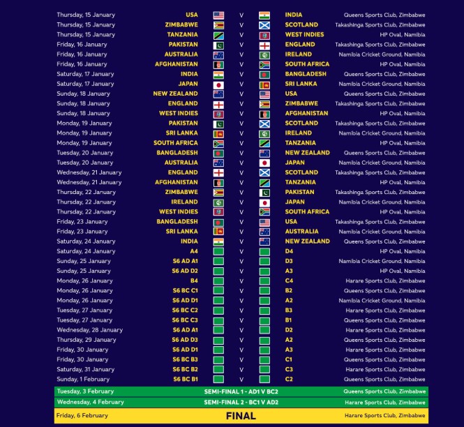 ਮੈਚਾਂ ਲਈ ਜ਼ਿੰਬਾਬਵੇ ਦੇ ਹਰਾਰੇ ਸਪੋਰਟਸ ਕਲੱਬ, ਤਾਕਾਸ਼ਿੰਗਾ ਸਪੋਰਟਸ ਕਲੱਬ ਅਤੇ ਕਵੀਨਜ਼ ਸਪੋਰਟਸ ਕਲੱਬ ਵਰਗੇ ਮੈਦਾਨਾਂ ਦੀ ਵਰਤੋਂ ਕੀਤੀ ਜਾਵੇਗੀ। ਨਾਮੀਬੀਆ ਵਿੱਚ, ਮੈਚ ਨਾਮੀਬੀਆ ਕ੍ਰਿਕਟ ਗਰਾਊਂਡ ਅਤੇ ਨਾਮੀਬੀਆ ਦੇ ਐਚਪੀ ਓਵਲ ਵਿੱਚ ਖੇਡੇ ਜਾਣਗੇ। ਵਿਸ਼ਵ ਕੱਪ ਵਿੱਚ ਹਿੱਸਾ ਲੈਣ ਵਾਲੀਆਂ 16 ਟੀਮਾਂ ਨੂੰ ਚਾਰ-ਚਾਰ ਟੀਮਾਂ ਦੇ ਚਾਰ ਗਰੁੱਪਾਂ (ਏ, ਬੀ, ਸੀ, ਡੀ) ਵਿੱਚ ਵੰਡਿਆ ਗਿਆ ਹੈ। ਫਾਈਨਲ ਦਾ ਰਸਤਾ ਸੁਪਰ ਸਿਕਸ ਪੜਾਅ ਅਤੇ ਸੈਮੀਫਾਈਨਲ ਰਾਹੀਂ ਤੈਅ ਹੋਵੇਗਾ।