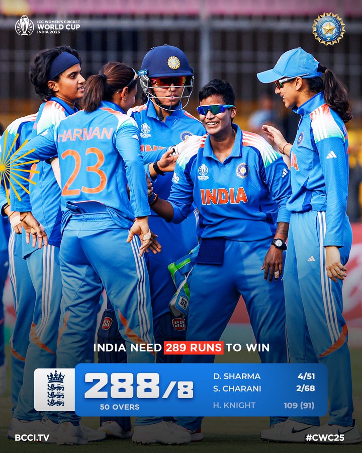 ਚੰਡੀਗੜ੍ਹ, 19ਅਕਤੂਬਰ(ਵਿਸ਼ਵ ਵਾਰਤਾ) IND vs ENG : ਮਹਿਲਾ ਵਨਡੇ ਵਿਸ਼ਵ ਕੱਪ ਦਾ 20ਵਾਂ ਮੈਚ ਭਾਰਤ ਅਤੇ ਇੰਗਲੈਂਡ ਵਿਚਕਾਰ ਖੇਡਿਆ ਜਾ ਰਿਹਾ ਹੈ। ਇੰਦੌਰ ਵਿੱਚ ਖੇਡੇ ਜਾ ਰਹੇ ਮੈਚ ਵਿੱਚ ਇੰਗਲੈਂਡ ਨੇ ਭਾਰਤ ਨੂੰ 289 ਦੌੜਾਂ ਦਾ ਟੀਚਾ ਦਿੱਤਾ। ਇੰਗਲੈਂਡ ਨੇ ਟਾਸ ਜਿੱਤ ਕੇ ਹੋਲਕਰ ਸਟੇਡੀਅਮ ਵਿੱਚ ਪਹਿਲਾਂ ਬੱਲੇਬਾਜ਼ੀ ਕਰਨ ਦਾ ਫੈਸਲਾ ਕੀਤਾ। ਹੀਥਰ ਨਾਈਟ (109 ਦੌੜਾਂ) ਦੇ ਸੈਂਕੜੇ ਦੀ ਬਦੌਲਤ, ਇੰਗਲੈਂਡ ਨੇ 50 ਓਵਰਾਂ ਵਿੱਚ 8 ਵਿਕਟਾਂ ਦੇ ਨੁਕਸਾਨ ‘ਤੇ 288 ਦੌੜਾਂ ਬਣਾਈਆਂ।