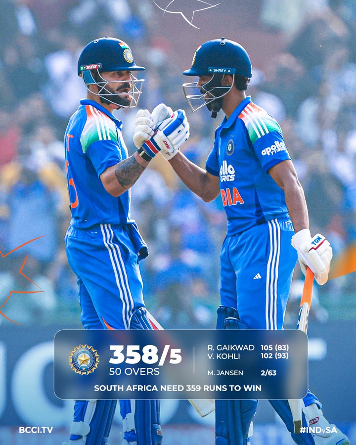 ਵਿਰਾਟ ਕੋਹਲੀ ਅਤੇ ਰੁਤੁਰਾਜ ਗਾਇਕਵਾੜ ਦੇ ਸੈਂਕੜਿਆਂ ਦੀ ਬਦੌਲਤ, ਭਾਰਤ ਨੇ ਦੂਜੇ ਇੱਕ ਰੋਜ਼ਾ ਮੈਚ ਵਿੱਚ ਦੱਖਣੀ ਅਫਰੀਕਾ ਨੂੰ 359 ਦੌੜਾਂ ਦਾ ਟੀਚਾ ਦਿੱਤਾ ਹੈ। ਟੀਮ ਇੰਡੀਆ ਨੇ 50 ਓਵਰਾਂ ਵਿੱਚ 5 ਵਿਕਟਾਂ ਦੇ ਨੁਕਸਾਨ ‘ਤੇ 358 ਦੌੜਾਂ ਬਣਾਈਆਂ। ਕਪਤਾਨ ਕੇਐਲ ਰਾਹੁਲ 66 ਅਤੇ ਰਵਿੰਦਰ ਜਡੇਜਾ 24 ਦੌੜਾਂ ‘ਤੇ ਅਜੇਤੂ ਰਹੇ।