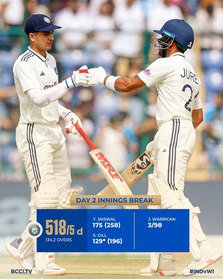 ਟੀਮ ਇੰਡੀਆ ਲਈ ਸਾਈ ਸੁਦਰਸ਼ਨ ਨੇ 87, ਧਰੁਵ ਜੁਰੇਲ ਨੇ 44 ਅਤੇ ਨਿਤੀਸ਼ ਕੁਮਾਰ ਰੈੱਡੀ ਨੇ 43 ਦੌੜਾਂ ਬਣਾਈਆਂ। ਵੈਸਟਇੰਡੀਜ਼ ਲਈ ਜੋਮੇਲ ਵਾਰਿਕਨ ਨੇ ਤਿੰਨ ਵਿਕਟਾਂ ਲਈਆਂ। ਭਾਰਤੀ ਸਪਿਨਰ ਰਵਿੰਦਰ ਜਡੇਜਾ ਨੇ ਕਪਤਾਨ ਰੋਸਟਨ ਚੇਜ਼ (ਜ਼ੀਰੋ), ਤੇਗਨਾਰਾਇਣ ਚੰਦਰਪਾਲ (34 ਦੌੜਾਂ) ਅਤੇ ਜੌਨ ਕੈਂਪਬੈਲ (10 ਦੌੜਾਂ) ਨੂੰ ਆਊਟ ਕੀਤਾ।