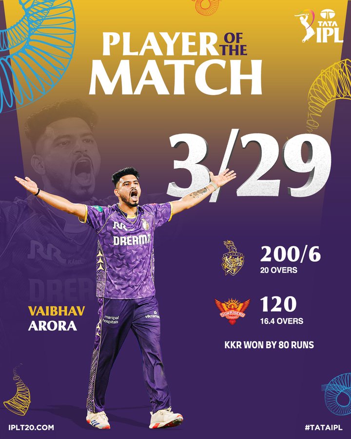 ਜਿਸ ਤੋਂ ਬਾਅਦ ਈਡਨ ਗਾਰਡਨ ਸਟੇਡੀਅਮ ਵਿੱਚ 201 ਦੌੜਾਂ ਦੇ ਟੀਚੇ ਦਾ ਪਿੱਛਾ ਕਰ ਰਹੀ ਹੈਦਰਾਬਾਦ ਦੀ ਟੀਮ 16.4 ਓਵਰਾਂ ਵਿੱਚ 120 ਦੌੜਾਂ ‘ਤੇ ਆਲ ਆਊਟ ਹੋ ਗਈ। ਵਰੁਣ ਚੱਕਰਵਰਤੀ ਅਤੇ ਵੈਭਵ ਅਰੋੜਾ ਨੇ 3-3 ਵਿਕਟਾਂ ਲਈਆਂ।
