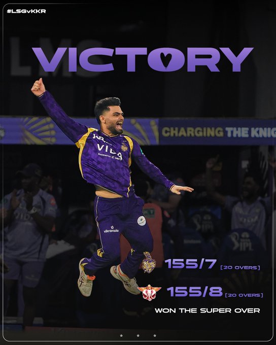ਜਵਾਬ ਵਿੱਚ, ਲਖਨਊ ਨੇ ਸਕੋਰ ਦੇ ਬਰਾਬਰੀ ਕੀਤੀ, 20 ਓਵਰਾਂ ਵਿੱਚ 8 ਵਿਕਟਾਂ ‘ਤੇ 155 ਦੌੜਾਂ ਬਣਾਈਆਂ, ਜਿਸ ਨਾਲ ਮੈਚ ਬਰਾਬਰ ਹੋ ਗਿਆ। ਆਖਰੀ ਗੇਂਦ ‘ਤੇ, ਮੁਹੰਮਦ ਸ਼ਮੀ ਨੇ ਛੱਕਾ ਮਾਰ ਕੇ ਮੁਕਾਬਲਾ ਬਰਾਬਰ ਕਰ ਦਿੱਤਾ। ਸੁਪਰ ਓਵਰ ਵਿੱਚ, ਕੋਲਕਾਤਾ ਲਈ ਗੇਂਦਬਾਜ਼ੀ ਕਰਦੇ ਹੋਏ ਸੁਨੀਲ ਨਰਾਇਣ ਨੇ ਲਖਨਊ ਨੂੰ ਸਿਰਫ਼ 1 ਦੌੜ ਤੱਕ ਸੀਮਤ ਕਰ ਦਿੱਤਾ ਅਤੇ ਦੋ ਵਿਕਟਾਂ ਵੀ ਲਈਆਂ। ਜਵਾਬ ਵਿੱਚ, ਰਿੰਕੂ ਸਿੰਘ ਨੇ ਚੌਕਾ ਲਗਾ ਕੇ ਟੀਮ ਨੂੰ ਜਿੱਤ ਦਵਾਈ। ਦੱਸ ਦਈਏ ਕਿ ਇਸ ਮੈਚ ਦੇ ਹੀਰੋ ਰਿੰਕੂ ਸਿੰਘ ਬਣੇ , ਜਿਸ ਨੇ 51 ਗੇਂਦਾਂ ‘ਤੇ ਅਜੇਤੂ 83 ਦੌੜਾਂ ਬਣਾਈਆਂ।