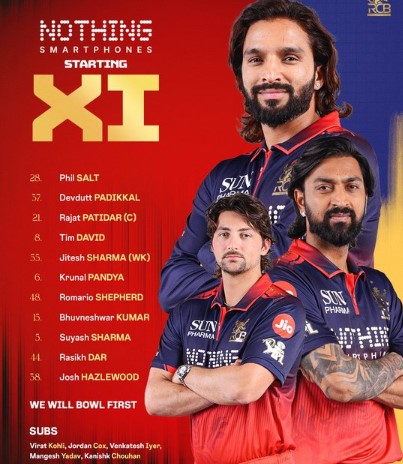 RCB: ਫਿਲ ਸਾਲਟ, ਦੇਵਦੱਤ ਪਡਿੱਕਲ, ਰਜਤ ਪਾਟੀਦਾਰ (ਕਪਤਾਨ), ਜਿਤੇਸ਼ ਸ਼ਰਮਾ, ਟਿਮ ਡੇਵਿਡ, ਰੋਮਾਰੀਓ ਸ਼ੈਫਰਡ, ਕਰੁਣਾਲ ਪੰਡਿਆ, ਭੁਵਨੇਸ਼ਵਰ ਕੁਮਾਰ, ਰਸਿਖ ਸਲਾਮ, ਜੋਸ਼ ਹੇਜ਼ਲਵੁੱਡ ਅਤੇ ਸੁਯਸ਼ ਸ਼ਰਮਾ। ਇਮਪੈਕਟ ਪਲੇਅਰਸ- ਵਿਰਾਟ ਕੋਹਲੀ।
