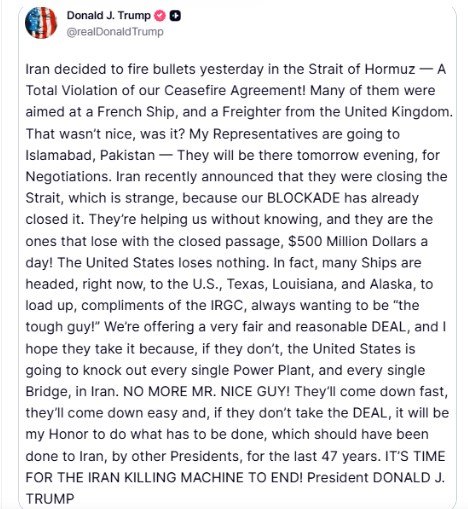 ਟਰੰਪ ਨੇ ਆਪਣੀ ਪੋਸਟ ਵਿੱਚ ਅੱਗੇ ਲਿਖਿਆ, “ਅਮਰੀਕਾ ਨੂੰ ਕੋਈ ਨੁਕਸਾਨ ਨਹੀਂ ਹੋ ਰਿਹਾ। ਸਗੋਂ, ਕਈ ਜਹਾਜ਼ ਹੁਣ ਅਮਰੀਕਾ ਵੱਲ ਜਾ ਰਹੇ ਹਨ—ਤੇਲ ਲੋਡ ਕਰਨ ਲਈ ਟੈਕਸਾਸ, ਲੁਈਸਿਆਨਾ ਅਤੇ ਅਲਾਸਕਾ। ਇਹ ਸਭ IRGC ਦੀ ਮਿਹਰਬਾਨੀ ਨਾਲ ਹੋ ਰਿਹਾ ਹੈ, ਜੋ ਹਮੇਸ਼ਾ ‘ਤਾਕਤਵਰ’ ਬਣਨ ਦੀ ਕੋਸ਼ਿਸ਼ ਕਰਦੇ ਹਨ! ਅਸੀਂ ਇੱਕ ਬਹੁਤ ਹੀ ਨਿਰਪੱਖ ਅਤੇ ਉਚਿਤ ਡੀਲ ਪੇਸ਼ ਕਰ ਰਹੇ ਹਾਂ। ਮੈਨੂੰ ਉਮੀਦ ਹੈ ਕਿ ਉਹ ਇਸਨੂੰ ਸਵੀਕਾਰ ਕਰ ਲੈਣਗੇ, ਕਿਉਂਕਿ ਜੇਕਰ ਨਹੀਂ ਕੀਤਾ ਤਾਂ ਸੰਯੁਕਤ ਰਾਜ ਅਮਰੀਕਾ ਇਰਾਨ ਦੇ ਹਰ ਪਾਵਰ ਪਲਾਂਟ ਅਤੇ ਹਰ ਪੁਲ ਨੂੰ ਤਬਾਹ ਕਰ ਦੇਵੇਗਾ। ਹੁਣ ਕੋਈ ਨਰਮ ਰੁਖ ਨਹੀਂ (NO MORE MR. NICE GUY!)! ਉਹ ਤੇਜ਼ੀ ਨਾਲ ਡਿੱਗਣਗੇ, ਆਸਾਨੀ ਨਾਲ ਡਿੱਗਣਗੇ। ਜੇਕਰ ਉਹ ਡੀਲ ਸਵੀਕਾਰ ਨਹੀਂ ਕਰਦੇ, ਤਾਂ ਜੋ ਕਰਨਾ ਪਵੇਗਾ ਉਹ ਕਰਨਾ ਮੇਰੇ ਲਈ ਸਨਮਾਨ ਦੀ ਗੱਲ ਹੋਵੇਗੀ—ਜੋ ਪਿਛਲੇ 47 ਸਾਲਾਂ ਤੋਂ ਹੋਰ ਰਾਸ਼ਟਰਪਤੀਆਂ ਨੂੰ ਇਰਾਨ ਨਾਲ ਕਰਨਾ ਚਾਹੀਦਾ ਸੀ। ਹੁਣ ਇਰਾਨ ਦੀ ਕਿਲਿੰਗ ਮਸ਼ੀਨ ਨੂੰ ਖ਼ਤਮ ਕਰਨ ਦਾ ਸਮਾਂ ਆ ਗਿਆ ਹੈ!”