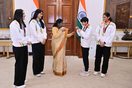 ਨਵੀਂ ਦਿੱਲੀ, 10 ਦਸੰਬਰ (ਵਿਸ਼ਵ ਵਾਰਤਾ) New Delhi : ਭਾਰਤ ਦੀ ਰਾਸ਼ਟਰਪਤੀ ਦ੍ਰੋਪਦੀ ਮੁਰਮੂ ਨੇ ਬੁੱਧਵਾਰ ਨੂੰ ਲਿਵਰਪੂਲ ਵਿੱਚ 2025 ਵਿਸ਼ਵ ਮੁੱਕੇਬਾਜ਼ੀ ਚੈਂਪੀਅਨਸ਼ਿਪ (2025 World Boxing Championships in Liverpool) ਵਿੱਚ ਭਾਰਤੀ ਮਹਿਲਾ ਮੁੱਕੇਬਾਜ਼ਾਂ ਨੂੰ ਉਨ੍ਹਾਂ ਦੀਆਂ ਪ੍ਰਾਪਤੀਆਂ ਲਈ ਸਨਮਾਨਿਤ ਕੀਤਾ।
