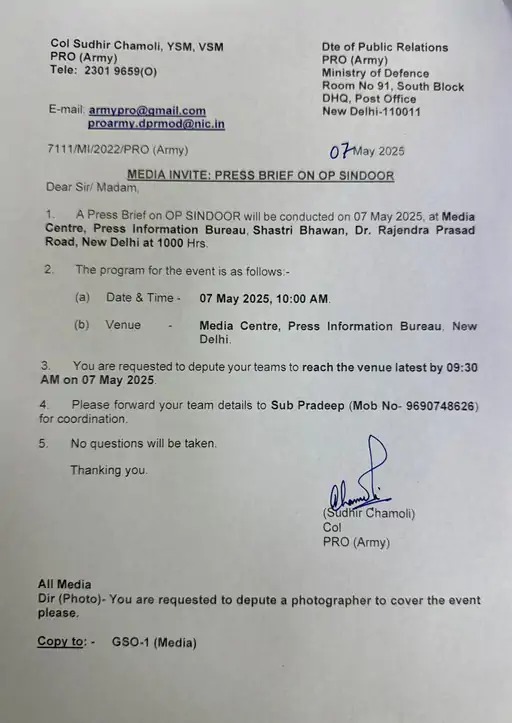 ਭਾਰਤੀ ਫੌਜ ਨੇ ਕਿਹਾ ਕਿ ਪਾਕਿਸਤਾਨੀ ਫੌਜੀ ਟਿਕਾਣਿਆਂ ਨੂੰ ਨਿਸ਼ਾਨਾ ਨਹੀਂ ਬਣਾਇਆ ਗਿਆ। ਅੱਤਵਾਦੀ ਟਿਕਾਣੇ ਨੂੰ ਨਿਸ਼ਾਨਾ ਬਣਾਇਆ ਗਿਆ ਹੈ। ਭਾਰਤੀ ਫੌਜ ਅੱਜ ਸਵੇਰੇ 10 ਵਜੇ ਆਪ੍ਰੇਸ਼ਨ ਸਿੰਦੂਰ ਸਬੰਧੀ ਪ੍ਰੈਸ ਕਾਨਫਰੰਸ ਕਰੇਗੀ। ਇਹ ਕਾਨਫਰੰਸ ਸ਼ਾਸਤਰੀ ਭਵਨ, ਨਵੀਂ ਦਿੱਲੀ ਵਿਖੇ ਹੋਵੇਗੀ।