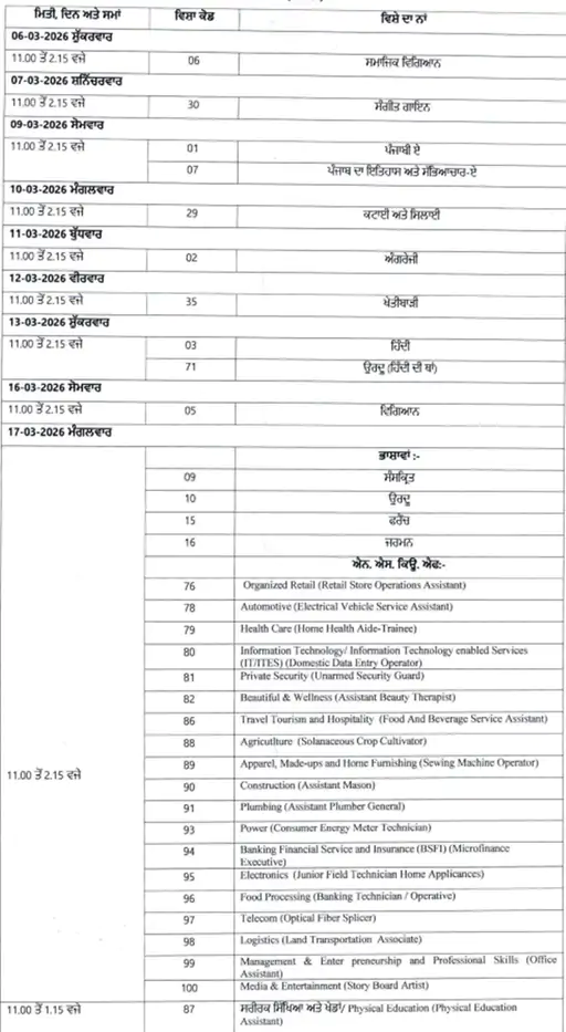 ਚੰਡੀਗੜ੍ਹ, 30 ਦਸੰਬਰ 2025 (ਵਿਸ਼ਵ ਵਾਰਤਾ): ਪੰਜਾਬ ਸਕੂਲ ਸਿੱਖਿਆ ਬੋਰਡ (PSEB) ਨੇ 8ਵੀਂ, 10ਵੀਂ ਅਤੇ 12ਵੀਂ ਜਮਾਤ ਦੀਆਂ ਲਿਖਤੀ ਪ੍ਰੀਖਿਆਵਾਂ ਦੀ ਡੇਟਸ਼ੀਟ ਜਾਰੀ ਕਰ ਦਿੱਤੀ ਹੈ। ਡੇਟਸ਼ੀਟ ਦੇ ਅਨੁਸਾਰ 8ਵੀਂ ਜਮਾਤ ਦੀਆਂ ਪ੍ਰੀਖਿਆਵਾਂ 17 ਫਰਵਰੀ ਤੋਂ ਸ਼ੁਰੂ ਹੋਣਗੀਆਂ ਅਤੇ 27 ਫਰਵਰੀ ਤੱਕ ਚੱਲਣਗੀਆਂ।