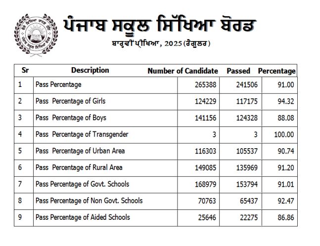 – 91 ਫੀਸਦੀ ਵਿਦਿਆਰਥੀ ਪਾਸ ਹੋਏ
