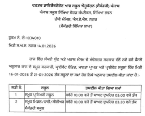 ਮੋਹਾਲੀ, 15 ਜਨਵਰੀ 2025 – ਪੰਜਾਬ ਸਰਕਾਰ (Punjab Breaking) ਵਲੋਂ ਸੂਬੇ ਵਿਚ ਸੰਘਣੀ ਧੁੰਦ ਤੇ ਖ਼ਰਾਬ ਮੌਸਮ ਦੇ ਕਾਰਨ ਸਕੂਲਾਂ ਦਾ ਸਮਾਂ ਬਦਲ ਦਿੱਤਾ ਗਿਆ ਹੈ। 16-01-2026 ਤੋਂ 21-01-2026 ਤੱਕ ਪੰਜਾਬ ਦੇ ਸਾਰੇ ਸਕੂਲ ਸਵੇਰੇ 10 ਵਜੇ ਲੱਗਣਗੇ।