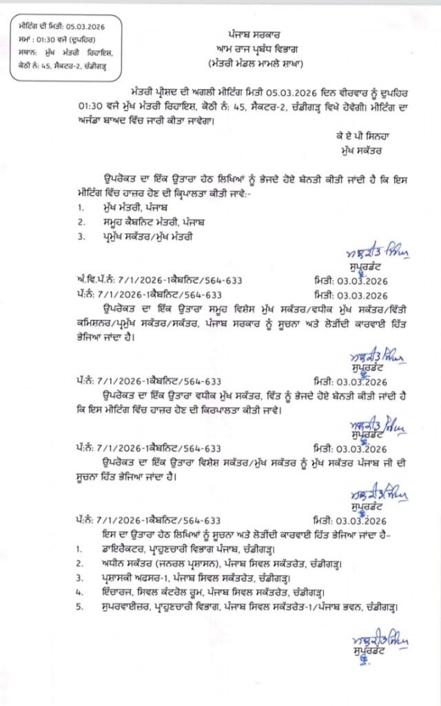 ਮੀਟਿੰਗ ‘ਚ ਕਈ ਅਹਿਮ ਮੁੱਦਿਆਂ ‘ਤੇ ਚਰਚਾ ਹੋਣ ਦੀ ਸੰਭਾਵਨਾ ਹੈ। ਇਹ ਮੀਟਿੰਗ ਪੰਜਾਬ ਸਰਕਾਰ ਦੇ ਬਜਟ ਸੈਸ਼ਨ ਤੋਂ ਇੱਕ ਦਿਨ ਪਹਿਲਾਂ ਬੁਲਾਈ ਗਈ ਹੈ। ਪੰਜਾਬ ਵਿਧਾਨ ਸਭਾ ਦਾ ਬਜਟ ਸੈਸ਼ਨ 6 ਮਾਰਚ ਸ਼ੁਰੂ ਹੋਵੇਗਾ। ਜਦੋਂ ਕਿ ਵਿੱਤੀ ਵਰੇ 2026-27 ਲਈ ਬਜਟ 8 ਮਾਰਚ ਦਿਨ ਐਤਵਾਰ ਨੂੰ ਪੇਸ਼ ਕੀਤਾ ਜਾਵੇਗਾ।