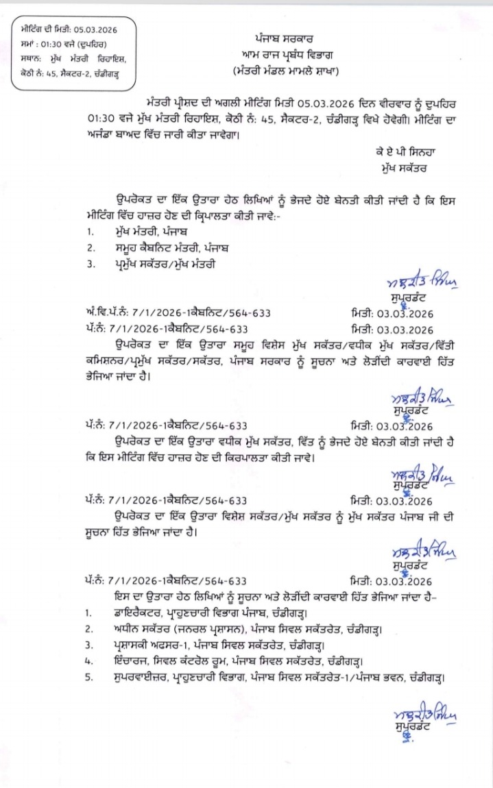 ਚੰਡੀਗੜ੍ਹ 3 ਮਾਰਚ 2026 (ਵਿਸ਼ਵ ਵਾਰਤਾ): ਮੁੱਖ ਮੰਤਰੀ ਭਗਵੰਤ ਸਿੰਘ ਮਾਨ ਨੇ ਪੰਜਾਬ ਕੈਬਿਨੇਟ ਦੀ ਅਹਿਮ ਮੀਟਿੰਗ ਸੱਦੀ ਹੈ। ਇਹ ਕੈਬਿਨੇਟ ਦੀ ਮੀਟਿੰਗ ਪੰਜ ਮਾਰਚ ਦਿਨ ਵੀਰਵਾਰ ਨੂੰ ਮੁੱਖ ਮੰਤਰੀ ਦੀ ਰਿਹਾਇਸ਼ ਵਿਖੇ ਦੁਪਹਿਰ 1:30 ਵਜੇ ਹੋਵੇਗੀ।
