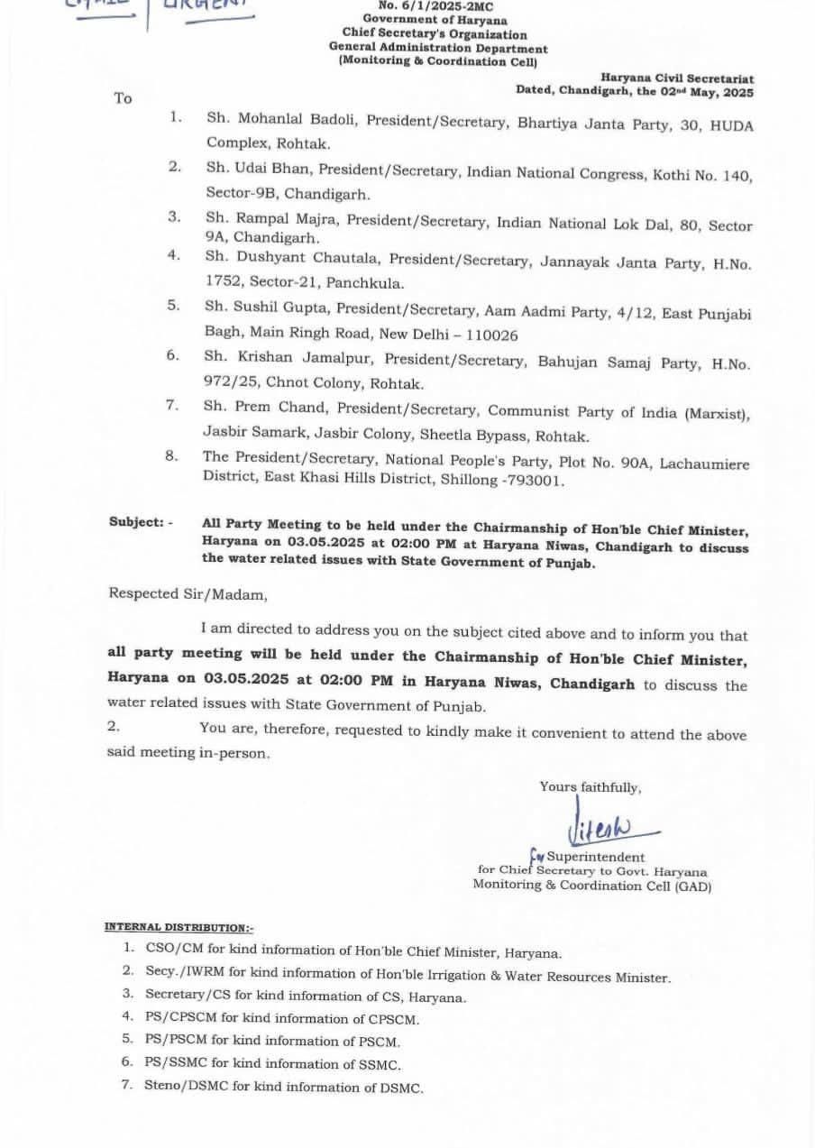 ਜ਼ਿਕਰਯੋਗ ਹੈ ਕਿ ਪਾਣੀ ਦੇ ਮੁੱਦੇ ਨੂੰ ਲੈ ਕੇ ਅੱਜ ਪੰਜਾਬ ਦੇ ਮੁੱਖ ਮੰਤਰੀ ਭਗਵੰਤ ਮਾਨ ਵੱਲੋਂ ਵੀ ਸਰਬ ਪਾਰਟੀ ਮੀਟਿੰਗ ਕੀਤੀ ਗਈ ਹੈ।