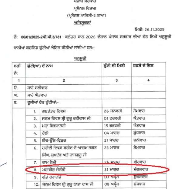 ਚੰਡੀਗੜ੍ਹ, 30 ਮਾਰਚ (ਵਿਸ਼ਵ ਵਾਰਤਾ): ਪੰਜਾਬ ਵਿੱਚ ਕੱਲ੍ਹ ਸਰਕਾਰੀ ਛੁੱਟੀ ਰਹੇਗੀ। ਇਹ ਫੈਸਲਾ ਮਹਾਵੀਰ ਜੈਯੰਤੀ ਦੇ ਪਵਿੱਤਰ ਦਿਹਾੜੇ ਨੂੰ ਮੁੱਖ ਰੱਖਦਿਆਂ ਲਿਆ ਗਿਆ ਹੈ। ਮਹਾਂਵੀਰ ਜਯੰਤੀ ਦੇ ਮੌਕੇ ਪੰਜਾਬ ਦੇ ਸਾਰੇ ਸਰਕਾਰੀ ਦਫ਼ਤਰ, ਸਕੂਲ ਅਤੇ ਕਾਲਜ ਬੰਦ ਰਹਿਣਗੇ। ਇਸ ਸਬੰਧ ਵਿੱਚ ਪਹਿਲਾਂ ਹੀ ਹੁਕਮ ਜਾਰੀ ਕੀਤੇ ਜਾ ਚੁੱਕੇ ਹਨ।