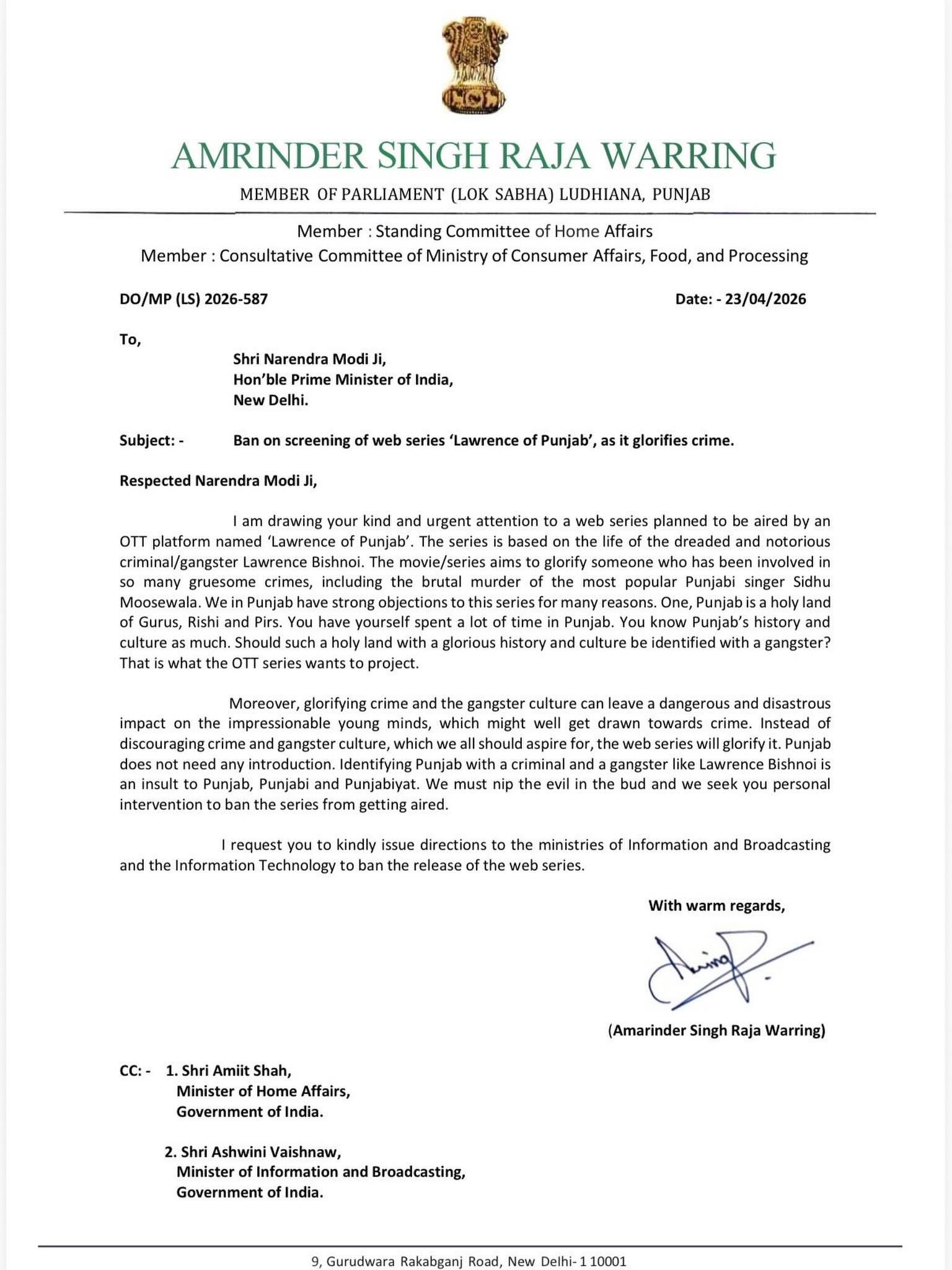 ਉਨ੍ਹਾਂ ਪੀਐਮ ਮੋਦੀ ਨੂੰ ਪੱਤਰ ਲਿਖ ਕੇ ਬੇਨਤੀ ਕੀਤੀ ਕਿ ਉਹ ਸੂਚਨਾ ਅਤੇ ਪ੍ਰਸਾਰਣ ਮੰਤਰਾਲੇ ਅਤੇ IT ਮੰਤਰਾਲੇ ਨੂੰ ਨਿਰਦੇਸ਼ ਜਾਰੀ ਕਰਨ ਕਿ ‘Lawrence of Punjab’ ਨਾਮ ਦੀ ਵੈੱਬ ਸੀਰੀਜ਼ ਦੀ ਰਿਲੀਜ਼ ‘ਤੇ ਪਾਬੰਦੀ ਲਗਾਈ ਜਾਵੇ, ਕਿਉਂਕਿ ਇਹ ਅਪਰਾਧ ਅਤੇ ਗੈਂਗਸਟਰ ਸੱਭਿਆਚਾਰ ਨੂੰ ਪ੍ਰੋਤਸਾਹਿਤ ਕਰਦੀ ਹੈ।ਪੰਜਾਬ ਗੁਰੂਆਂ ਅਤੇ ਪੀਰਾਂ ਦੀ ਧਰਤੀ ਹੈ,ਇਸ ਪਵਿੱਤਰ ਧਰਤੀ ਨੂੰ ਕਿਸੇ ਅਪਰਾਧੀ ਨਾਲ ਜੋੜਨਾ ਪੰਜਾਬ, ਪੰਜਾਬੀਆਂ ਅਤੇ ਪੰਜਾਬੀਅਤ ਦੀ ਇਤਿਹਾਸਕ ਅਤੇ ਸੱਭਿਆਚਾਰਕ ਵਿਰਾਸਤ ਦਾ ਅਪਮਾਨ ਹੈ।”