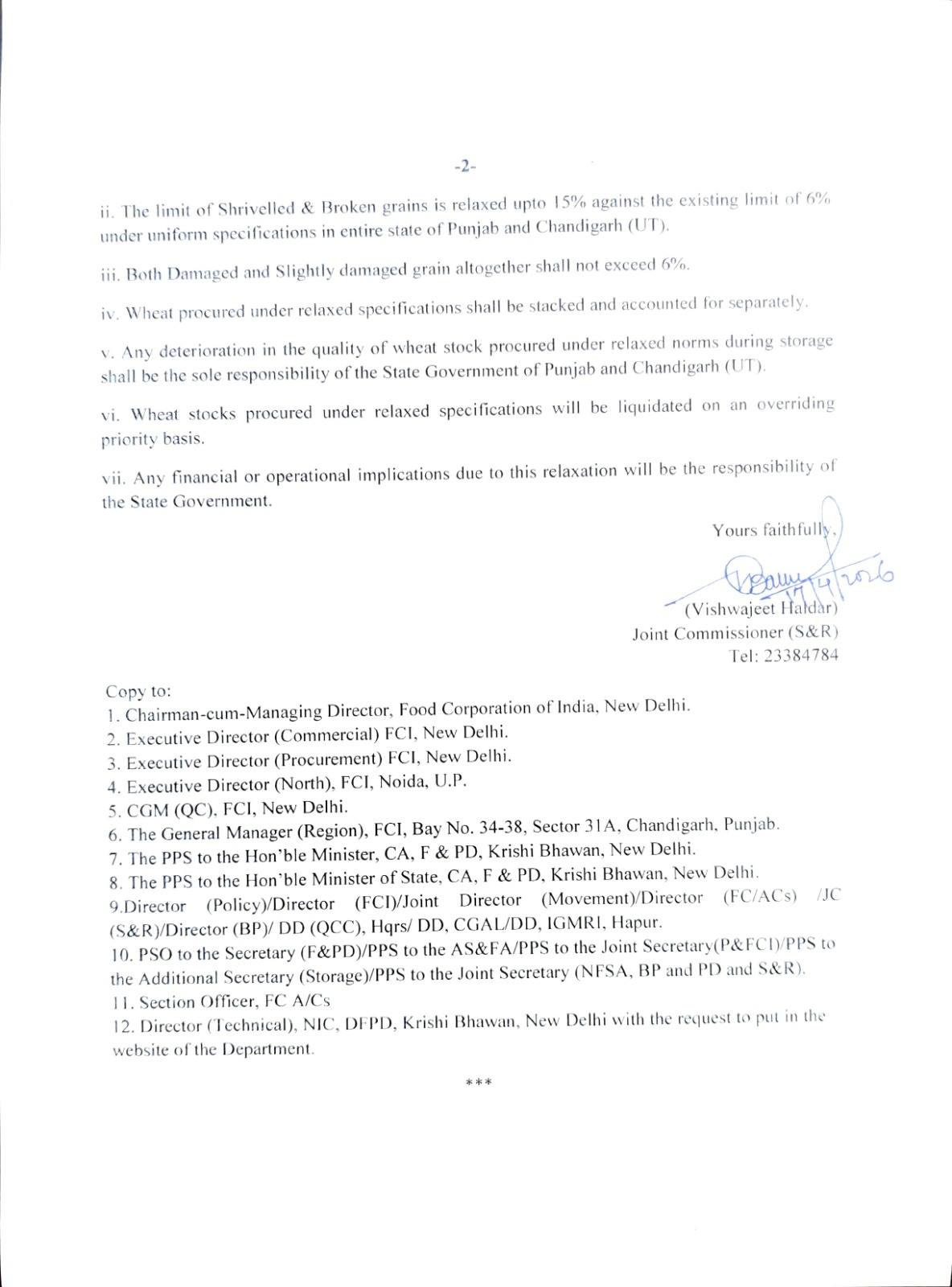 – ਨਵੇਂ ਮਾਪਦੰਡਾਂ ਤਹਿਤ ਖਰੀਦੀ ਗਈ ਕਣਕ ਦੇ ਭੰਡਾਰਨ ਦੌਰਾਨ ਗੁਣਵੱਤਾ ਵਿੱਚ ਕਿਸੇ ਵੀ ਤਰ੍ਹਾਂ ਦੀ ਗਿਰਾਵਟ ਲਈ ਪੰਜਾਬ ਸਰਕਾਰ ਅਤੇ ਚੰਡੀਗੜ੍ਹ (ਯੂ.ਟੀ.) ਖੁਦ ਜ਼ਿੰਮੇਵਾਰ ਹੋਣਗੇ।ਨਵੇਂ ਮਾਪਦੰਡਾਂ ਤਹਿਤ ਖਰੀਦੇ ਗਏ ਕਣਕ ਦੇ ਸਟਾਕ ਦਾ ਨਿਪਟਾਰਾ ਪਹਿਲ ਦੇ ਅਧਾਰ ‘ਤੇ ਕੀਤਾ ਜਾਵੇਗਾ। ਇਸ ਛੋਟ ਕਾਰਨ ਪੈਦਾ ਹੋਣ ਵਾਲੇ ਕਿਸੇ ਵੀ ਵਿੱਤੀ ਜਾਂ ਸੰਚਾਲਨ ਸਬੰਧੀ ਪ੍ਰਭਾਵ ਦੀ ਜ਼ਿੰਮੇਵਾਰੀ ਰਾਜ ਸਰਕਾਰ ਦੀ ਹੋਵੇਗੀ।