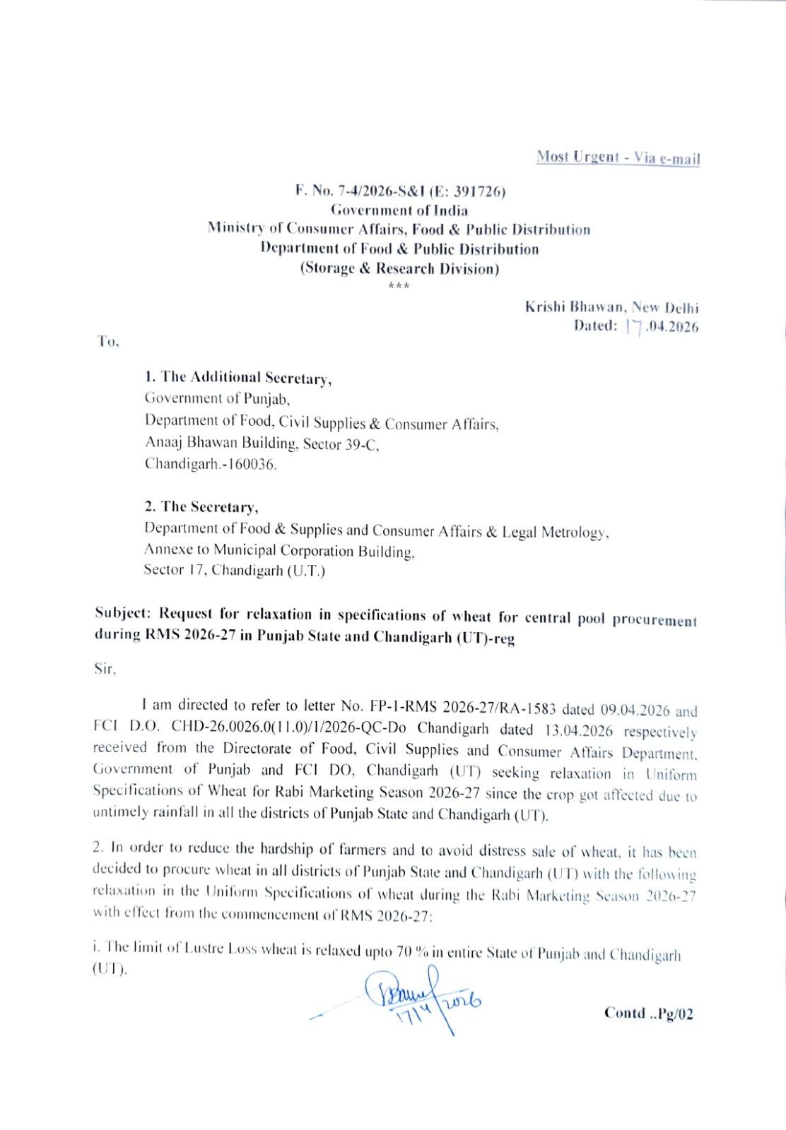 ਚੰਡੀਗੜ੍ਹ, 17 ਅਪ੍ਰੈਲ 2026 (ਵਿਸ਼ਵ ਵਾਰਤਾ): ਬੇਮੌਸਮੀ ਬਰਸਾਤ ਦੀ ਮਾਰ ਝੱਲ ਰਹੇ ਪੰਜਾਬ ਦੇ ਕਿਸਾਨਾਂ ਲਈ ਵੱਡੀ ਰਾਹਤ ਦੀ ਖਬਰ ਹੈ। ਮੀਂਹ ਅਤੇ ਗੜ੍ਹੇਮਾਰੀ ਕਾਰਨ ਪ੍ਰਭਾਵਿਤ ਹੋਈ ਫ਼ਸਲ ਨੂੰ ਧਿਆਨ ਵਿੱਚ ਰੱਖਦਿਆਂ ਕੇਂਦਰ ਸਰਕਾਰ ਨੇ ਪੰਜਾਬ ਦੇ ਕਿਸਾਨਾਂ ਨੂੰ ਵੱਡੀ ਰਾਹਤ ਦਿੱਤੀ ਹੈ। ਰਬੀ ਮਾਰਕੀਟਿੰਗ ਸੀਜ਼ਨ (RMS) 2026-27 ਤਹਿਤ ਕਣਕ ਦੀ ਖਰੀਦ ਲਈ ਮਿੱਥੇ ਗਏ ਮਾਪਦੰਡਾਂ ਵਿੱਚ ਵਿਸ਼ੇਸ਼ ਛੋਟ ਦਿੱਤੀ ਗਈ ਹੈ। ਇਹ ਫੈਸਲਾ ਪੰਜਾਬ ਦੇ ਸਾਰੇ ਜ਼ਿਲ੍ਹਿਆਂ ਦੇ ਨਾਲ-ਨਾਲ ਚੰਡੀਗੜ੍ਹ (ਯੂ.ਟੀ.) ‘ਤੇ ਵੀ ਲਾਗੂ ਹੋਵੇਗਾ।