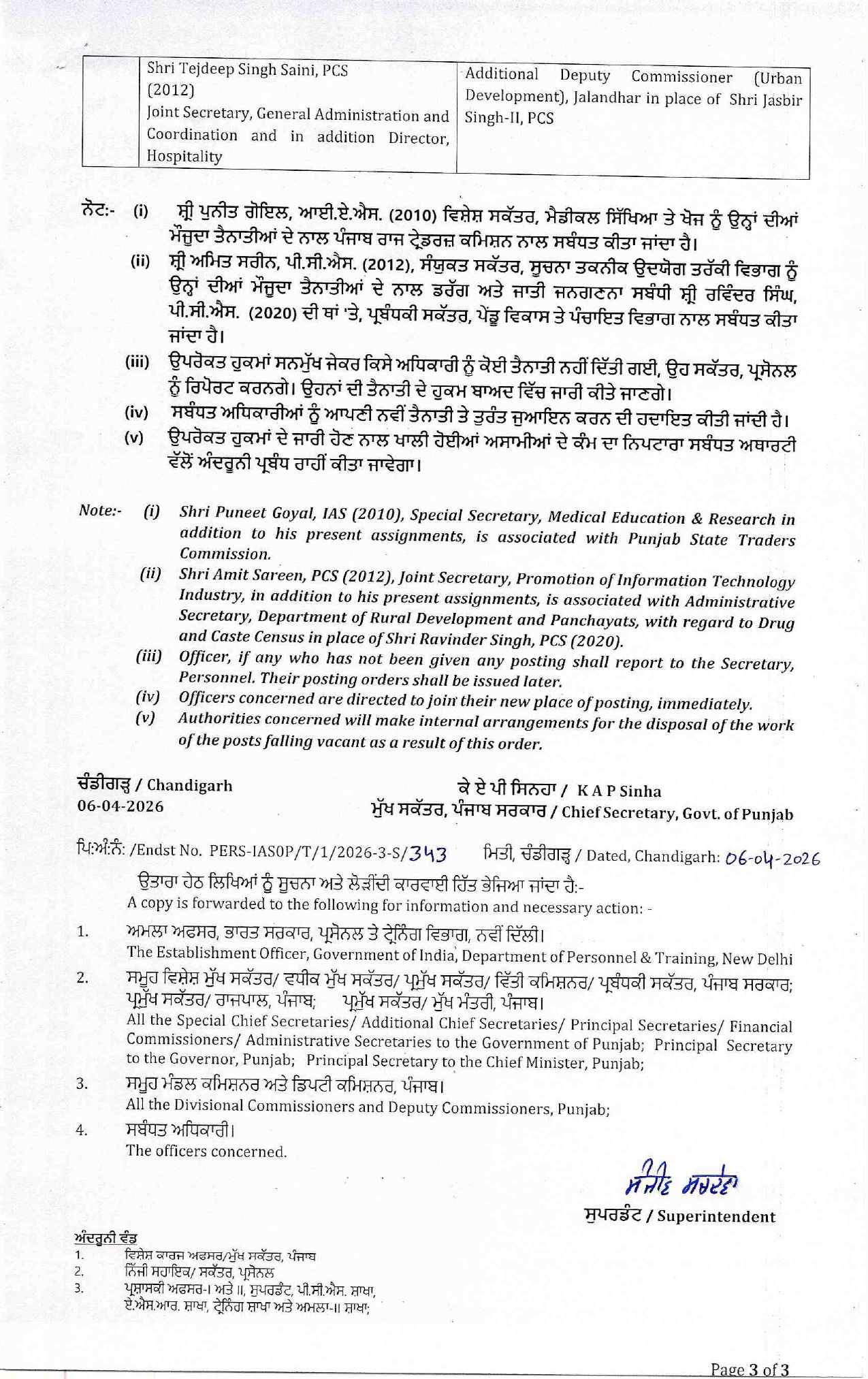 ਚੰਡੀਗੜ੍ਹ, 6 ਅਪ੍ਰੈਲ (ਵਿਸ਼ਵ ਵਾਰਤਾ) –ਪੰਜਾਬ ਸਰਕਾਰ ਵੱਲੋਂ ਪ੍ਰਸ਼ਾਸਨਿਕ ਤਬਦੀਲੀਆਂ ਦੇ ਤਹਿਤ ਵੱਡੇ ਪੱਧਰ ‘ਤੇ IAS/PCS ਅਧਿਕਾਰੀਆਂ ਦੇ ਤਬਾਦਲੇ ਕੀਤੇ ਗਏ ਹਨ। ਇਹ ਤਬਾਦਲੇ ਤੁਰੰਤ ਪ੍ਰਭਾਵ ਨਾਲ ਲਾਗੂ ਕੀਤੇ ਗਏ ਹਨ। ਸਰਕਾਰ ਵੱਲੋਂ ਜਾਰੀ ਹੁਕਮਾਂ ਅਨੁਸਾਰ 12 IAS ਅਤੇ 1 PCS ਬਦਲੇ ਗਏ ਹਨ।