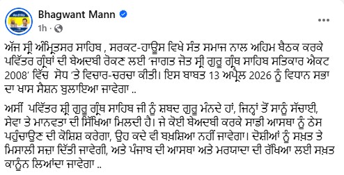 ਦੱਸ ਦਈਏ ਕਿ ਅੱਜ ਪੰਜਾਬ ਦੇ ਮੁੱਖ ਮੰਤਰੀ ਭਗਵੰਤ ਮਾਨ ਨੇ ਸ੍ਰੀ ਅੰਮ੍ਰਿਤਸਰ ਸਾਹਿਬ, ਸਰਕਟ-ਹਾਊਸ ਵਿਖੇ ਸੰਤ ਸਮਾਜ ਦੇ ਨੁਮਾਇੰਦਿਆਂ ਨਾਲ਼ ਅਹਿਮ ਬੈਠਕ ਕੀਤੀ। ਬੈਠਕ ਵਿੱਚ ਪਵਿੱਤਰ ਗ੍ਰੰਥਾਂ ਦੀ ਬੇਅਦਬੀ ਰੋਕਣ ਲਈ ‘ਜਾਗਤ ਜੋਤ ਸ੍ਰੀ ਗੁਰੂ ਗ੍ਰੰਥ ਸਾਹਿਬ ਸਤਿਕਾਰ ਐਕਟ 2008’ ਵਿੱਚ ਸੋਧ ‘ਤੇ ਵਿਚਾਰ-ਚਰਚਾ ਕੀਤੀ। ਇਸ ਦੌਰਾਨ ਮੁੱਖ ਮੰਤਰੀ ਮਾਨ ਨੇ ਸੰਤ ਸਮਾਜ ਦੇ ਨੁਮਾਇੰਦਿਆਂ ਨੂੰ ਭਰੋਸਾ ਦੁਆਇਆ ਕਿ ਇਸ ਬਾਬਤ ਆਉਣ ਵਾਲ਼ੀ 13 ਅਪ੍ਰੈਲ ਨੂੰ ਵਿਧਾਨ ਸਭਾ ਦਾ ਖ਼ਾਸ ਸੈਸ਼ਨ ਬੁਲਾਇਆ ਜਾਵੇਗਾ।