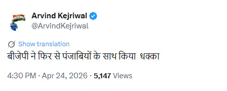ਨਵੀ ਦਿੱਲੀ , 24 ਅਪ੍ਰੈਲ 2026 (ਵਿਸ਼ਵ ਵਾਰਤਾ) –ਰਾਜ ਸਭਾ ਮੈਂਬਰ ਰਾਘਵ ਚੱਢਾ, ਅਸ਼ੋਕ ਮਿੱਤਲ ਅਤੇ ਸੰਦੀਪ ਪਾਠਕ ਨੇ ਅੱਜ ਆਮ ਆਦਮੀ ਪਾਰਟੀ ਛੱਡਣ ਦਾ ਐਲਾਨ ਕੀਤਾ। ਇਸ ਦੇ ਨਾਲ ਹੀ ਉਨ੍ਹਾਂ ਭਾਜਪਾ ਵਿੱਚ ਸ਼ਾਮਲ ਹੋਣ ਦੀ ਗੱਲ ਵੀ ਕਹੀ। ਇਸ ਘਟਨਾਕ੍ਰਮ ਤੋਂ ਬਾਅਦ ਪਾਰਟੀ ਦੇ ਕੌਮੀ ਕਨਵੀਨਰ ਅਰਵਿੰਦ ਕੇਜਰੀਵਾਲ ਨੇ ਆਪਣੀ ਪ੍ਰਤੀਕਿਰਿਆ ਦਿੱਤੀ ਅਤੇ ਸੋਸ਼ਲ ਮੀਡੀਆ ‘ਐਕਸ’ ‘ਤੇ ਲਿਖਿਆ ਕਿ “ਬੀਜੇਪੀ ਨੇ ਫਿਰ ਤੋਂ ਪੰਜਾਬੀਆਂ ਨਾਲ ਧੋਖਾ ਕੀਤਾ ਹੈ।”