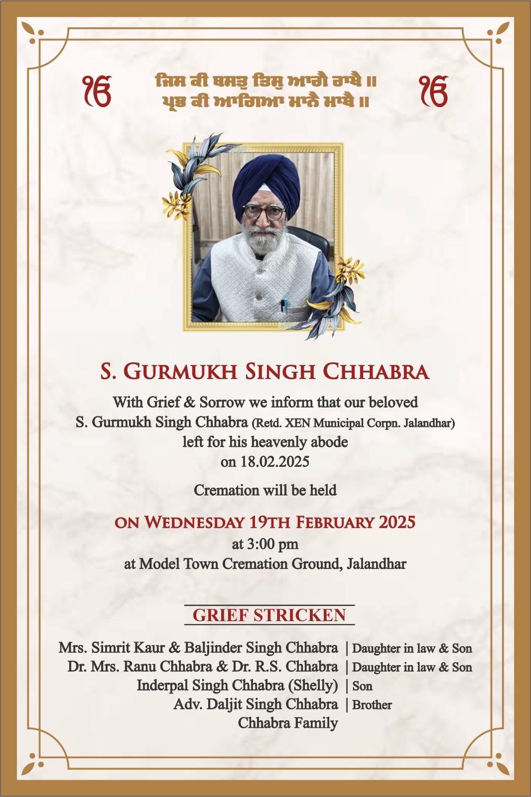 ਚੰਡੀਗੜ੍ਹ, 18ਫਰਵਰੀ(ਵਿਸ਼ਵ ਵਾਰਤਾ) Sad News : ਇਹ ਖ਼ਬਰ ਬੜੇ ਦੁੱਖ ਨਾਲ ਪੜ੍ਹੀ ਜਾਵੇਗੀ ਕਿ ਐਡਵੋਕੇਟ ਤੇ ਕਾਨੂੰਨੀ ਵਿਸ਼ਲੇਸ਼ਕ ਦਲਜੀਤ ਸਿੰਘ ਛਾਬੜਾ ਨੂੰ ਉਸ ਸਮੇਂ ਗਹਿਰਾ ਸਦਮਾ ਲੱਗਾ ਜਦੋਂ ਅੱਜ ਉਹਨਾਂ ਨੇ ਭਰਾ ਗੁਰਮੁੱਖ ਸਿੰਘ ਛਾਬੜਾ ਇਸ ਫਾਨੀ ਸੰਸਾਰ ਨੂੰ ਅਲਵਿਦਾ ਆਖ ਗਏ। ਗੁਰਮੁੱਖ ਸਿੰਘ ਛਾਬੜਾ ਦਾ ਅੰਤਿਮ ਸੰਸਕਾਰ ਕੱਲ੍ਹ ਨੂੰ ਜਲੰਧਰ ਵਿਖੇ ਕੀਤਾ ਜਾਵੇਗਾ।