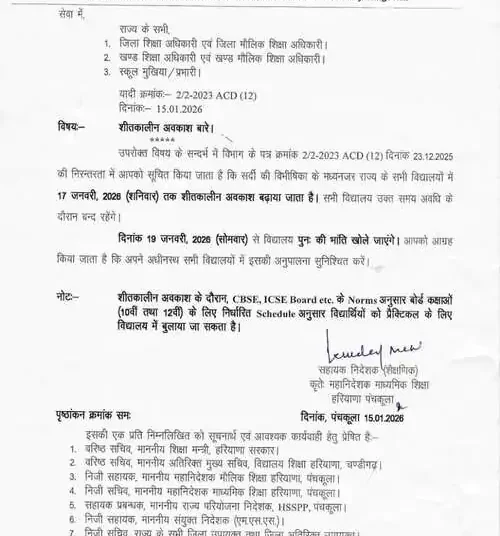 ਦੱਸ ਦਈਏ ਕਿ ਹਰਿਆਣਾ ਵਿੱਚ ਠੰਢ ਅਤੇ ਸੀਤ ਲਹਿਰ ਦੇ ਮੱਦੇਨਜ਼ਰ ਸਕੂਲਾਂ ਦੀਆਂ ਛੁੱਟੀਆਂ ਵਧਾ ਦਿੱਤੀਆਂ ਗਈਆਂ ਹਨ। ਸਕੂਲ ਸਿੱਖਿਆ ਡਾਇਰੈਕਟੋਰੇਟ ਨੇ ਇੱਕ ਹੁਕਮ ਜਾਰੀ ਕਰਕੇ ਕਿਹਾ ਹੈ ਕਿ ਸਾਰੇ ਸਕੂਲ 17 ਜਨਵਰੀ ਤੱਕ ਬੰਦ ਰਹਿਣਗੇ। ਸਾਰੇ ਸਰਕਾਰੀ ਅਤੇ ਨਿੱਜੀ ਸਕੂਲ 19 ਜਨਵਰੀ ਨੂੰ ਦੁਬਾਰਾ ਖੁੱਲ੍ਹਣਗੇ। ਇਸ ਦੌਰਾਨ ਸੀਬੀਐਸਈ ਅਤੇ ਆਈਸੀਐਸਈ ਬੋਰਡ ਦੀਆਂ ਪ੍ਰੈਕਟੀਕਲ ਪ੍ਰੀਖਿਆਵਾਂ ਆਮ ਵਾਂਗ ਜਾਰੀ ਰਹਿਣਗੀਆਂ।