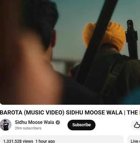 ਚੰਡੀਗੜ੍ਹ, 28 ਨਵੰਬਰ 2025 (ਵਿਸ਼ਵ ਵਾਰਤਾ): ਮਰਹੂਮ ਪੰਜਾਬੀ ਗਾਇਕ ਸਿੱਧੂ ਮੂਸੇਵਾਲਾ (Sidhu Moose wala) ਦਾ ਨਵਾਂ ਗੀਤ, “ਬਰੋਟਾ” ਰਿਲੀਜ਼ ਹੋ ਗਿਆ ਹੈ। ਮੂਸੇਵਾਲਾ ਦਾ ਨਵਾਂ ਗੀਤ 4 ਮਿੰਟ ਅਤੇ 3 ਸਕਿੰਟ ਲੰਬਾ ਹੈ। ਪ੍ਰਸ਼ੰਸਕ ਇਸਨੂੰ ਉਸਦੇ ਯੂਟਿਊਬ ਚੈਨਲ ‘ਤੇ ਤੇਜ਼ੀ ਨਾਲ ਦੇਖ ਰਹੇ ਹਨ ਅਤੇ ਖੂਬ ਪਸੰਦ ਵੀ ਕਰ ਰਹੇ ਹਨ। ਗੀਤ ਸੁਣਨ ਵਾਲਿਆਂ ਦੀ ਗਿਣਤੀ ਤੇਜ਼ੀ ਨਾਲ ਵੱਧ ਰਹੀ ਹੈ।ਪਹਿਲੇ 30 ਮਿੰਟਾਂ ‘ਚ ਹੀ ਇਸ ਗੀਤ ਨੂੰ ਪਹਿਲਾਂ ਹੀ 6 ਲੱਖ ਤੋਂ ਵੱਧ ਵਿਊਜ਼, 225,000 ਲਾਈਕਸ ਅਤੇ 100,000 ਕਮੈਂਟ ਮਿਲ ਮਿਲ ਗਏ ਅਤੇ ਇਕ ਘੰਟੇ ‘ਚ 13 ਲੱਖ ਤੋਂ ਵੱਧ ਲੋਕ ਇਸ ਗੀਤ ਨੂੰ ਵੇਖ ਚੁੱਕੇ ਹਨ।