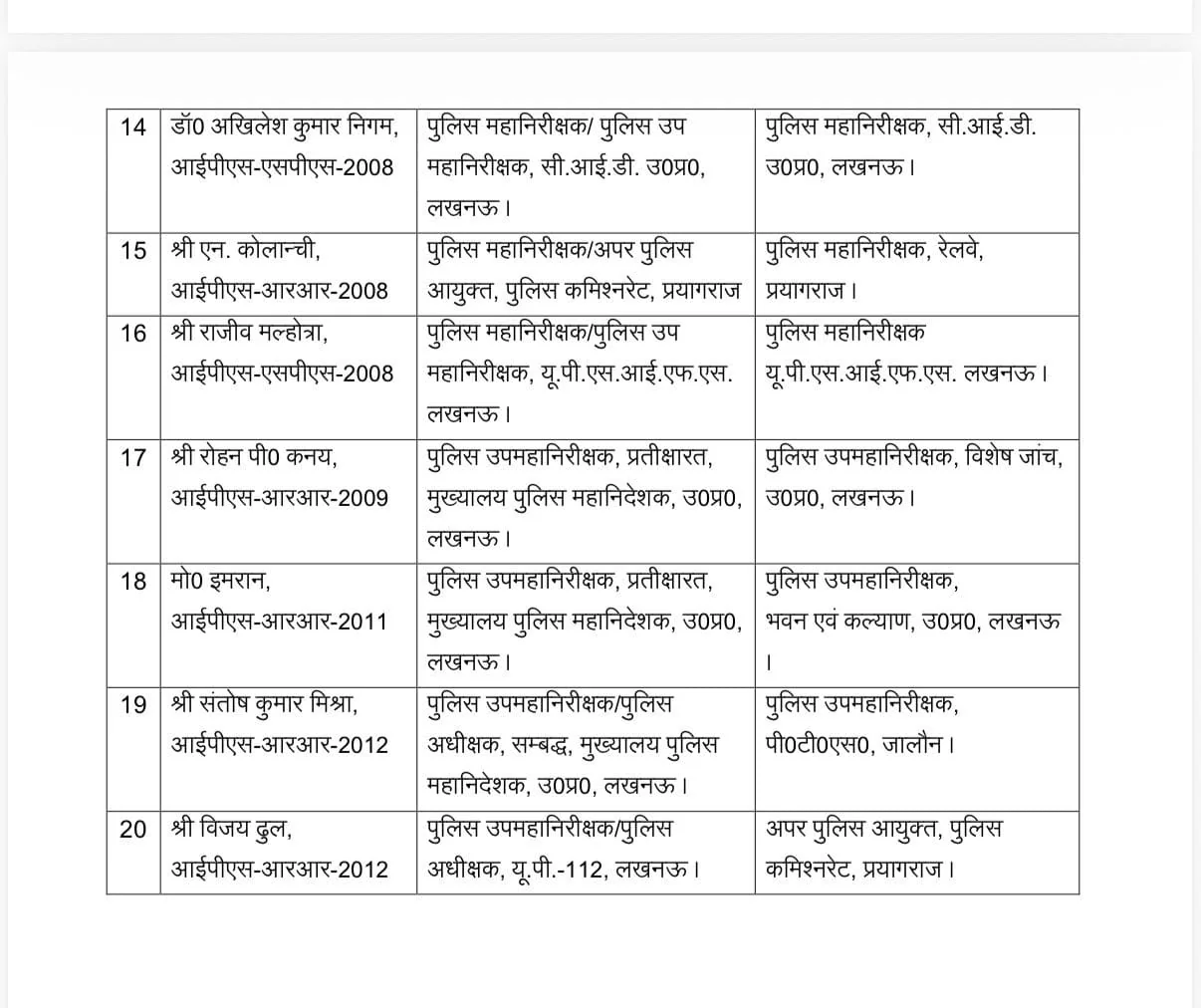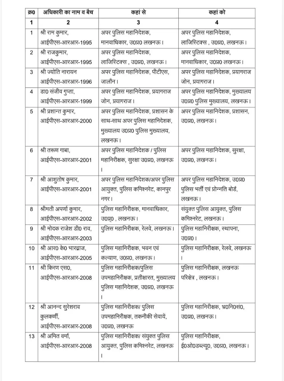ਉੱਤਰ ਪ੍ਰਦੇਸ਼, 7 ਜਨਵਰੀ (ਵਿਸ਼ਵ ਵਾਰਤਾ): ਉੱਤਰ ਪ੍ਰਦੇਸ਼ ਵਿੱਚ ਇੱਕ ਵੱਡਾ ਪ੍ਰਸ਼ਾਸਕੀ ਫੇਰਬਦਲ ਹੋਇਆ ਹੈ। ਵੀਹ ਆਈਪੀਐਸ ਅਧਿਕਾਰੀਆਂ ਦੇ ਤਬਾਦਲੇ (Transfer) ਕੀਤੇ ਗਏ ਹਨ। ਪ੍ਰਯਾਗਰਾਜ ਜ਼ੋਨ ਦੇ ਏਡੀਜੀ ਨੂੰ ਵੀ ਹਟਾ ਦਿੱਤਾ ਗਿਆ ਹੈ। ਜਿਨ੍ਹਾਂ ਅਧਿਕਾਰੀਆਂ ਦਾ ਤਬਾਦਲਾ ਕੀਤਾ ਗਿਆ ਹੈ ਉਨ੍ਹਾਂ ਵਿੱਚ ਰਾਮ ਕੁਮਾਰ, ਰਾਜਕੁਮਾਰ, ਜੋਤੀ ਨਾਰਾਇਣ, ਡਾ. ਸੰਜੀਵ ਗੁਪਤਾ, ਪ੍ਰਸ਼ਾਂਤ ਕੁਮਾਰ, ਤਰੁਣ ਗਾਬਾ, ਆਸ਼ੂਤੋਸ਼ ਕੁਮਾਰ ਸਣੇ ਕਈ ਵੱਡੇ ਨਾਮ ਸ਼ਾਮਿਲ ਹਨ, ਹੇਠਾਂ ਪੜ੍ਹੋ ਪੂਰੀ ਲਿਸਟ