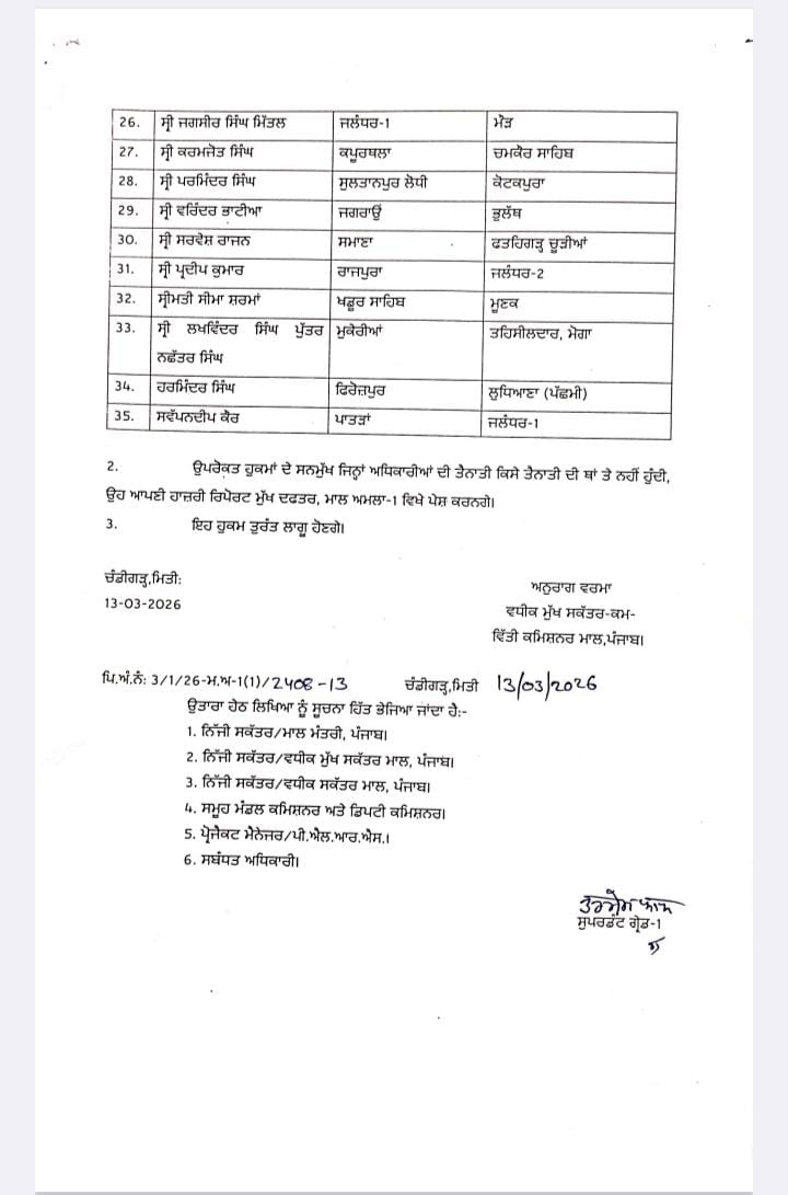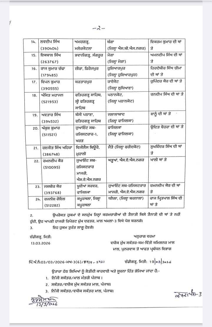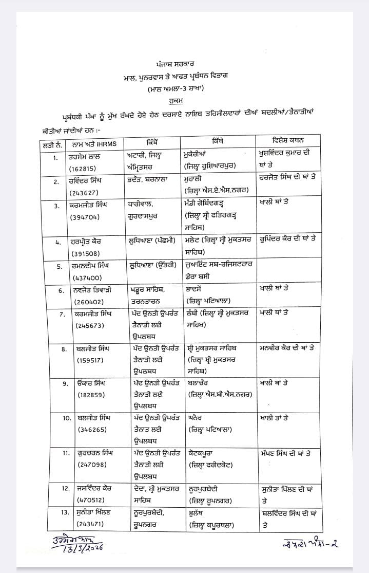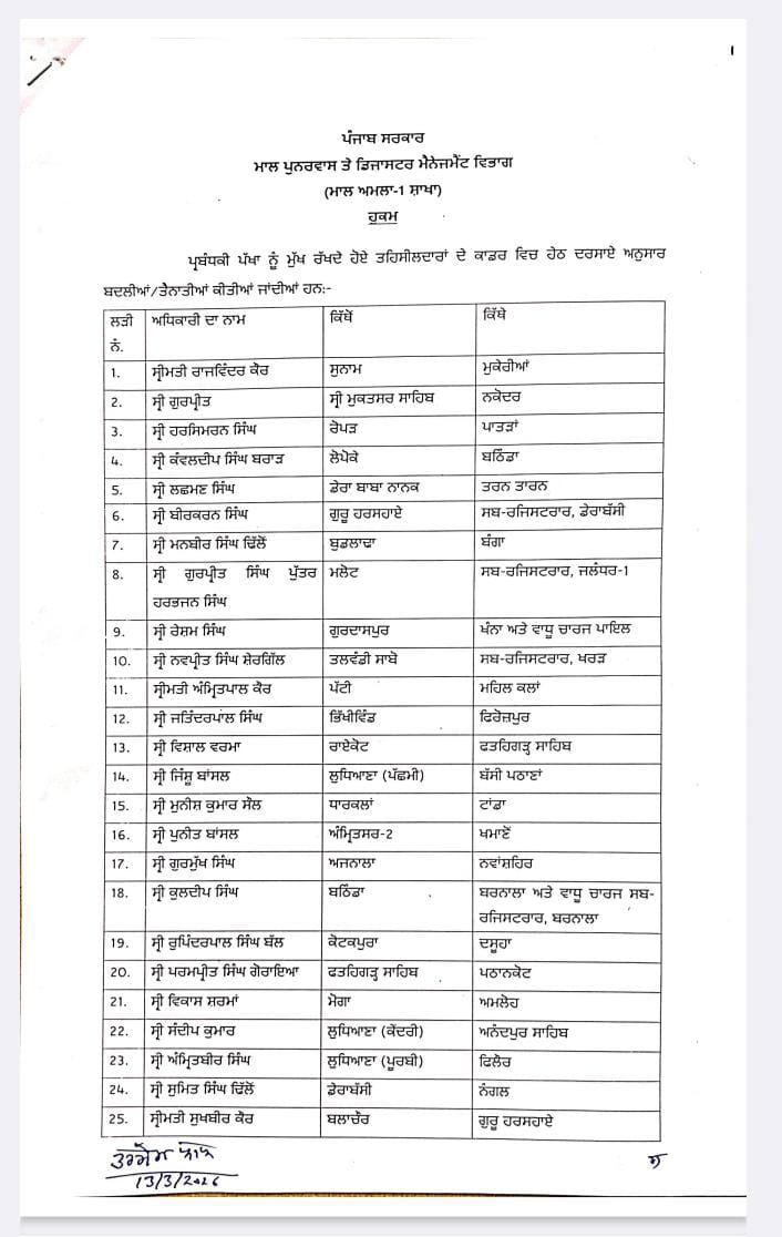 ਵੱਡਾ ਫੇਰਬਦਲ : 35 ਤਹਿਸੀਲਦਾਰਾਂ ਅਤੇ 24 ਨਾਇਬ ਤਹਿਸੀਲਦਾਰਾਂ ਦੇ ਤਬਾਦਲੇ