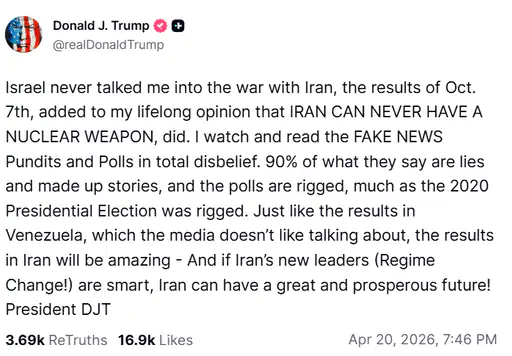 ਇਸ ਤੋਂ ਇਲਾਵਾ ਟਰੰਪ ਨੇ ਇਕ ਹੋਰ ਵੱਡਾ ਬਿਆਨ ਦਿੱਤਾ ਹੈ । ਟ੍ਰੰਪ ਨੇ ਕਿਹਾ ਕਿ ਈਰਾਨ ਦੇ ਖ਼ਿਲਾਫ਼ ਜੰਗ ਦਾ ਫੈਸਲਾ ਉਨ੍ਹਾਂ ਦਾ ਆਪਣਾ ਸੀ ਅਤੇ ਇਸ ਵਿੱਚ ਇਜ਼ਰਾਈਲ ਦੀ ਕੋਈ ਭੂਮਿਕਾ ਨਹੀਂ ਸੀ। ਉਨ੍ਹਾਂ ਨੇ ‘ਟਰੂਥ ਸੋਸ਼ਲ’ ‘ਤੇ ਪੋਸਟ ਕਰਕੇ ਲਿਖਿਆ ਕਿ ਇਜ਼ਰਾਈਲ ਨੇ ਮੈਨੂੰ ਈਰਾਨ ਨਾਲ ਜੰਗ ਵਿੱਚ ਨਹੀਂ ਧੱਕਿਆ।ਟਰੰਪ ਨੇ ਦੱਸਿਆ ਕਿ ਇਸ ਫੈਸਲੇ ਦੇ ਪਿੱਛੇ ਦੀ ਵਜ੍ਹਾ ਈਰਾਨ ਨੂੰ ਪ੍ਰਮਾਣੂ ਹਥਿਆਰ ਨਾ ਬਣਾਉਣ ਦੇਣਾ ਅਤੇ 7 ਅਕਤੂਬਰ 2023 ਨੂੰ ਇਜ਼ਰਾਈਲ-ਹਮਾਸ ਦੇ ਹਮਲੇ ਦੀ ਘਟਨਾ ਸੀ। ਟਰੰਪ ਨੇ ਇਹ ਵੀ ਕਿਹਾ ਕਿ ਜੇਕਰ ਈਰਾਨ ਵਿੱਚ ਨਵੀਂ ਲੀਡਰਸ਼ਿਪ ਸਮਝਦਾਰੀ ਨਾਲ ਕੰਮ ਕਰੇ, ਤਾਂ ਦੇਸ਼ ਦਾ ਭਵਿੱਖ ਬਿਹਤਰ ਅਤੇ ਖੁਸ਼ਹਾਲ ਹੋ ਸਕਦਾ ਹੈ।
